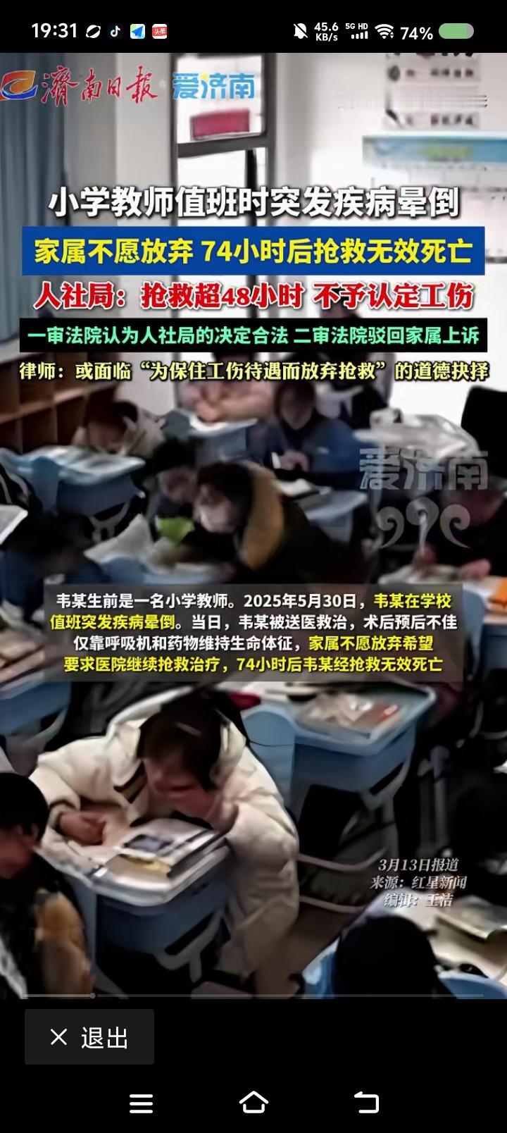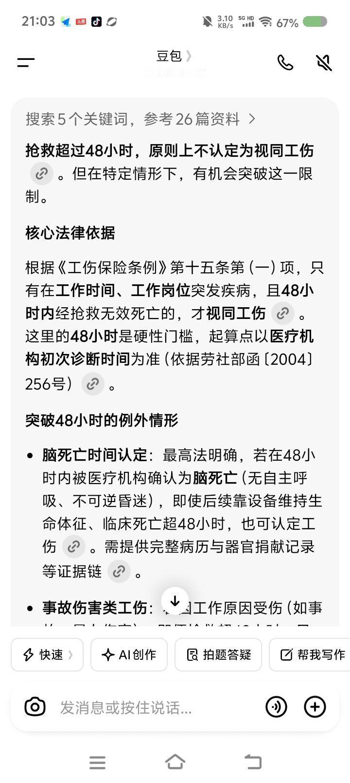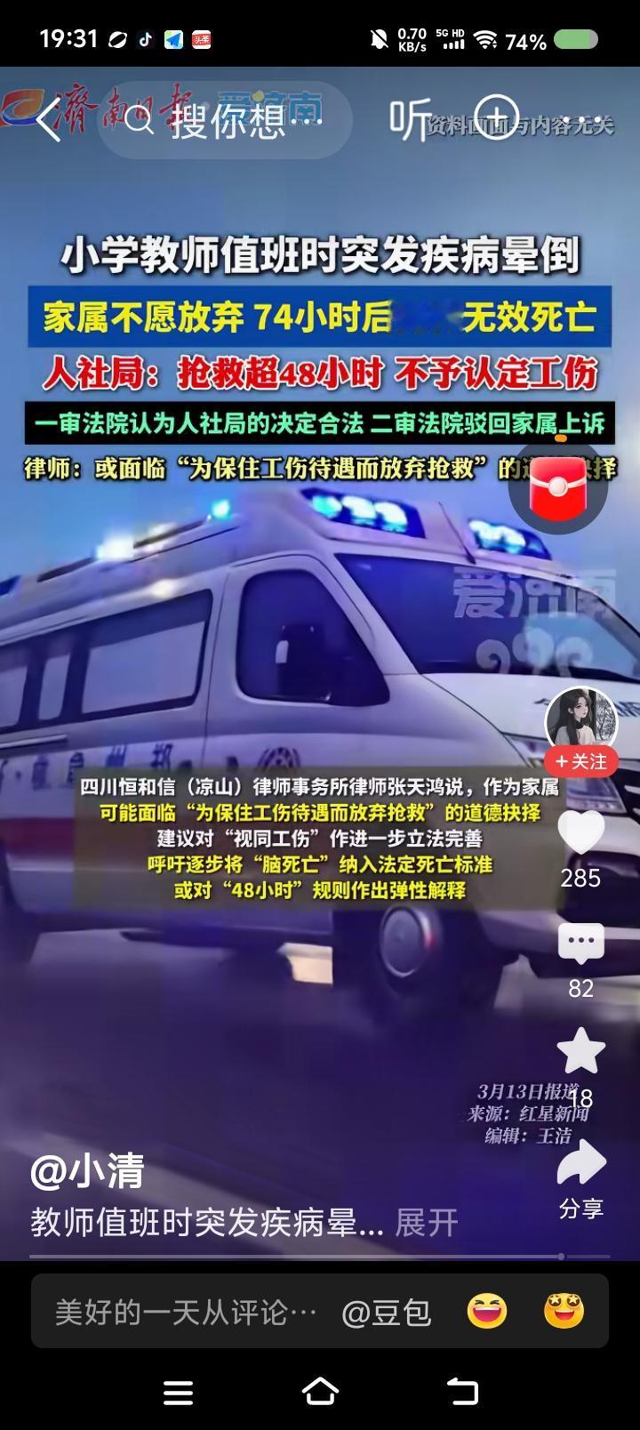为何“工伤”、“视同工伤”认定这么难?—— 据报道,某教师值班时发病。术后预后不佳。家属要求继续治疗。74小时后死亡。人社局以抢救超过48小时为由不认定为工伤。 家属认为发病不到24小时已脑死亡。 法院二审驳回家属主张。 点评: 豆大叔认为,48小时内脑死亡,即使后续维持生命体征超过48小时,且有遗体捐献记录,证据链完整,也可认定为“视同工伤。”“48小时以医疗机构初次诊断为开瑞。” 此案中,家属败诉,应是提供的证据不足。