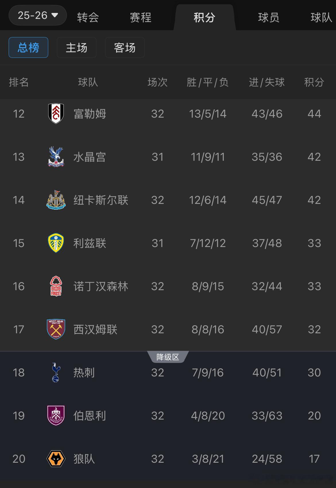英超32轮后 热刺进入了降级区 这谁能想到 热刺之前还是big6 成员呢 英超创立至今六大俱乐部从未降级 热刺不知道会不会改变这个历史