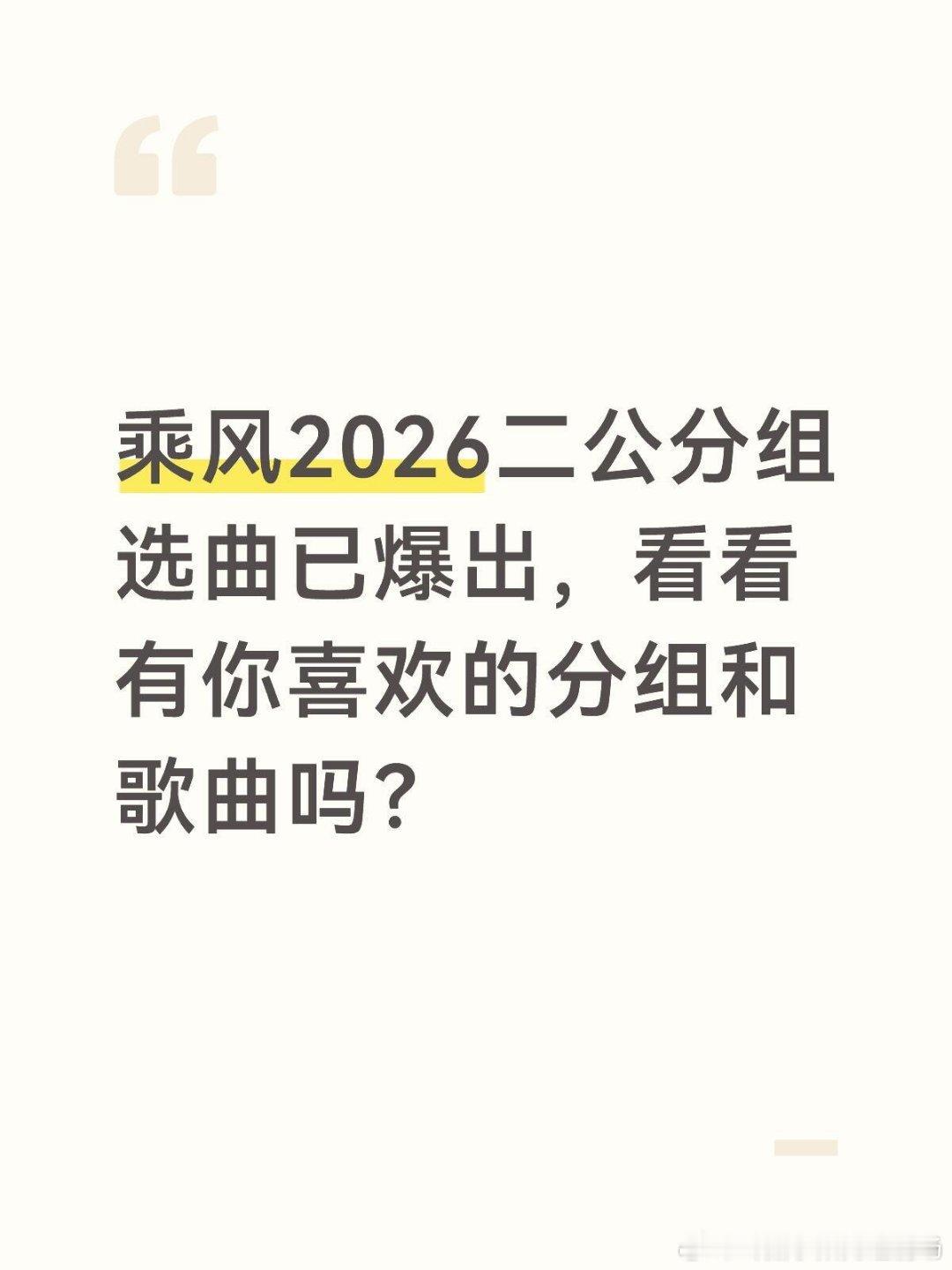 乘风2026二公分组选曲如下1⃣️叶一茜 范玮琪 江语晨 孙怡《亲亲》(原唱:梁静茹)2⃣️李心洁 谢楠 陶昕然 徐梦洁《春风绕》(原唱:司南,王秋实)3⃣️李小冉 侯宇 徐洁儿 阚清子《我会等》(原唱:承恒)4⃣️曾沛慈 黄灿灿 王濛 《篇章》(原唱:张韶涵/王赫野)5⃣️淡淡 何宣林 唐艺昕 陈凯琳《bonbon girl》(原唱:硬糖少女303)6️⃣张月 陈瑶 者来女 张慧雯《孤单北半球》(原唱:欧得洋/林依晨)7️⃣乌兰图雅 万千惠 代斯 张艺上《 达拉崩吧》(原唱:洛天依)8️⃣庄法 温峥嵘 安崎 萧蔷《恋我癖》(原唱:蔡依林)