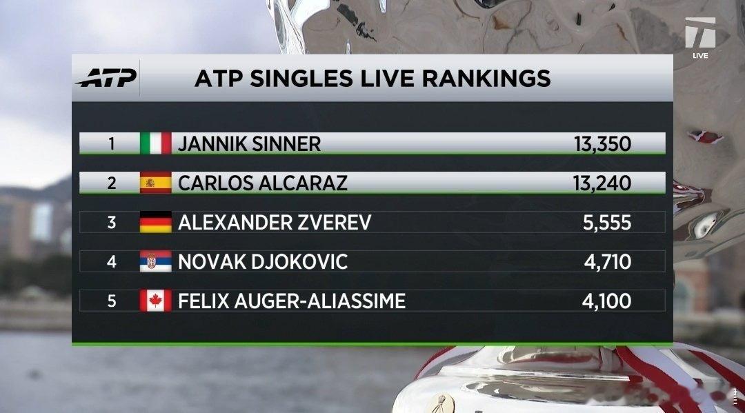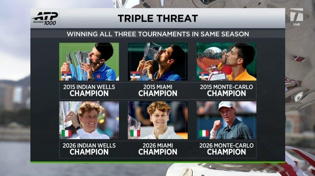 【有一种叫做辛卡和其他人】单赛季连夺印第安维尔斯+迈阿密+蒙特卡洛的只有两人:2015:德约科维奇2026:辛纳大师赛冠军数:40 德约科维奇36 纳达尔28 费德勒17 阿加西14 穆雷11 桑普拉斯8 穆斯特8 阿尔卡拉斯8 辛纳辛纳首夺蒙特卡洛冠军辛纳重夺世界第一ATP