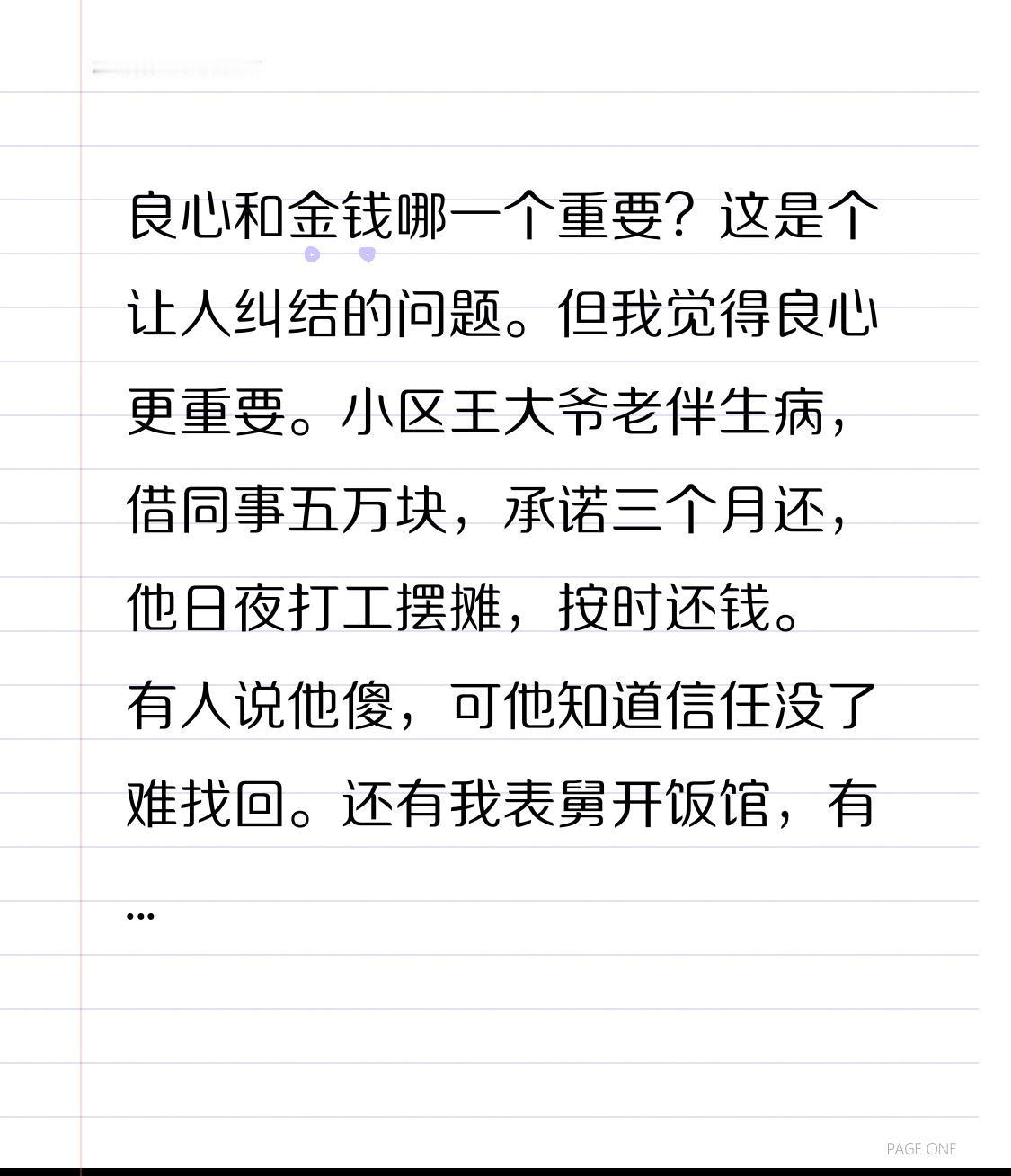 良心和金钱哪一个重要?这是个让人纠结的问题。但我觉得良心更重要。 小区王大爷老伴生病,借同事五万块,承诺三个月还,他日夜打工摆摊,按时还钱。有人说他傻,可他知道信任没了难找回。还有我表舅开饭馆,有人劝他用便宜食材多赚钱,他拒绝,怕坑了街坊,坏了良心,生意也做不长久。 钱没了能再赚,良心丢了,路会越走越窄。所有收获藏在人品里,失去源于贪念短视。守住良心,才是守住福气。