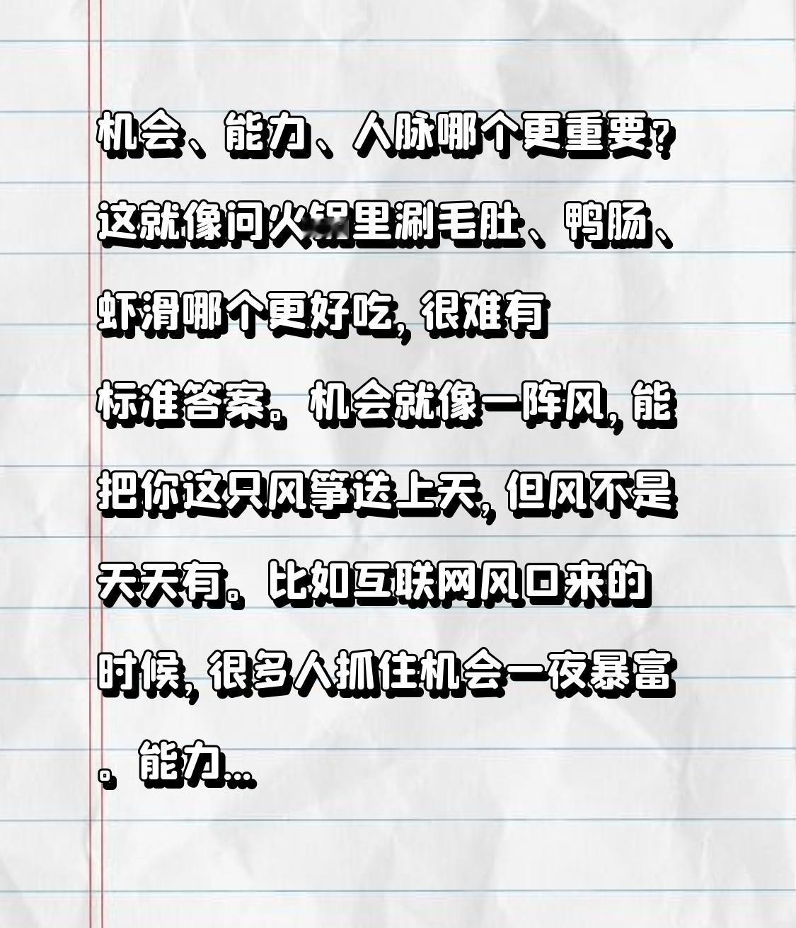 机会、能力、人脉哪个更重要?这就像问火锅里涮毛肚、鸭肠、虾滑哪个更好吃,很难有标准答案。 机会就像一阵风,能把你这只风筝送上天,但风不是天天有。比如互联网风口来的时候,很多人抓住机会一夜暴富。 能力是你安身立命的根本。有能力,机会来了才能稳稳抓住。就像厨师,刀工、火候都过硬,啥菜都能做。 人脉则像一张网,能帮你捕获更多机会。认识的人多了,消息灵通,资源也多。 我觉得这三者缺一不可。机会靠运气,能力靠努力,人脉靠经营。只有把它们都利用好,才能在人生路上一路开挂。