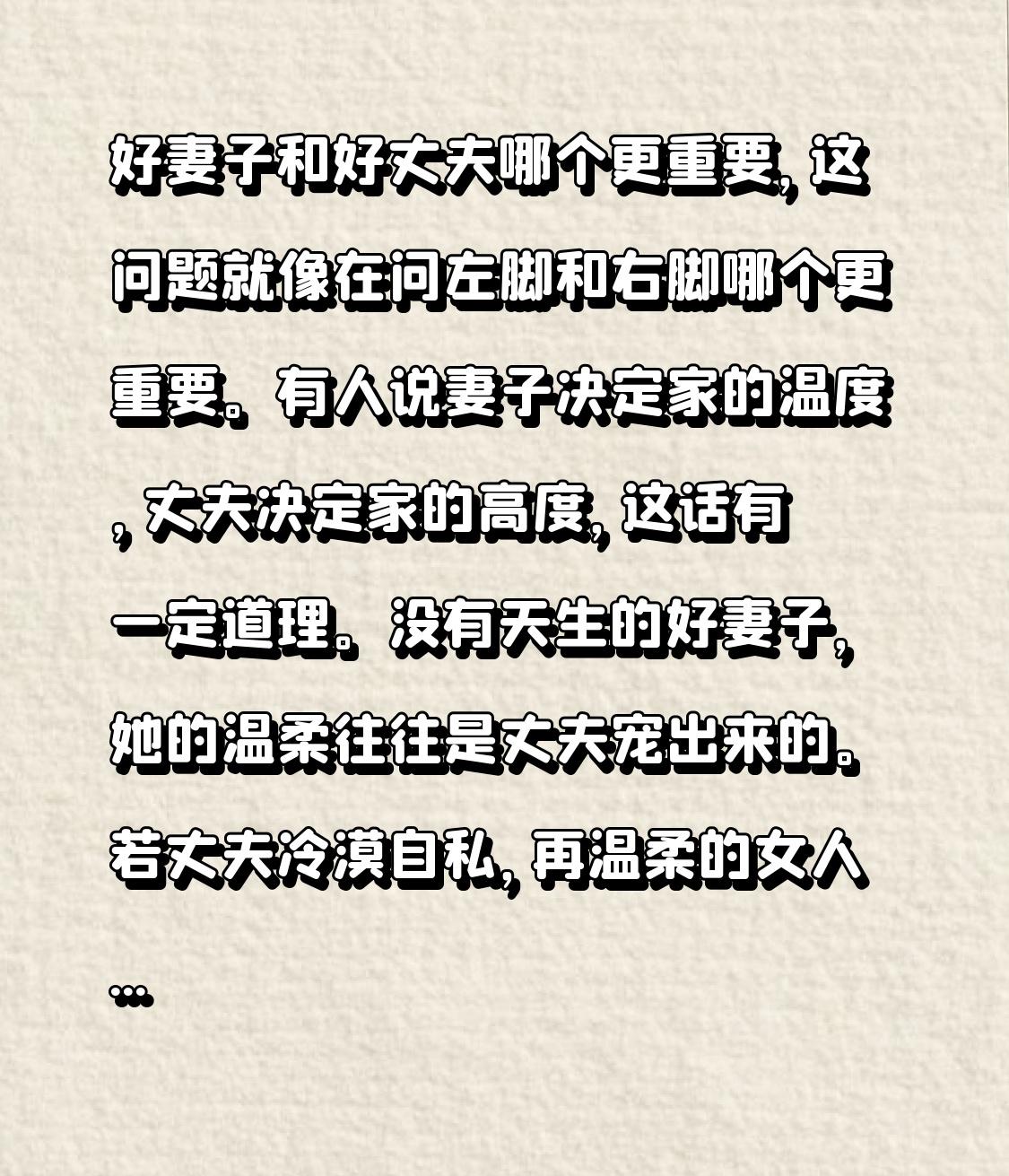 好妻子和好丈夫哪个更重要,这问题就像在问左脚和右脚哪个更重要。有人说妻子决定家的温度,丈夫决定家的高度,这话有一定道理。 没有天生的好妻子,她的温柔往往是丈夫宠出来的。若丈夫冷漠自私,再温柔的女人也会变刺猬。同样,没有天生的好丈夫,他的担当是妻子暖出来的。妻子整日抱怨,再优秀的男人也会消沉。 真正好的婚姻是双向奔赴,家庭幸福不是一方的事。把家庭重担全压在妻子或丈夫一人身上都不对,只有两人相互理解、支持,婚姻这艘船才能平稳前行。