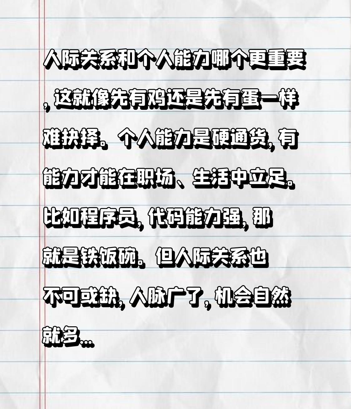 人际关系和个人能力哪个更重要,这就像先有鸡还是先有蛋一样难抉择。个人能力是硬通货,有能力才能在职场、生活中立足。比如程序员,代码能力强,那就是铁饭碗。但人际关系也不可或缺,人脉广了,机会自然就多。 而人品,那可是行走江湖的“通行证”。人品好的人,大家都愿意与之交往,运气也不会太差。就像做生意,诚信经营,客户自然会越来越多。我觉得人品就是最好的运气,它能为你积攒人脉,带来意想不到的机会。所以,咱都得把人品这块招牌擦亮咯!