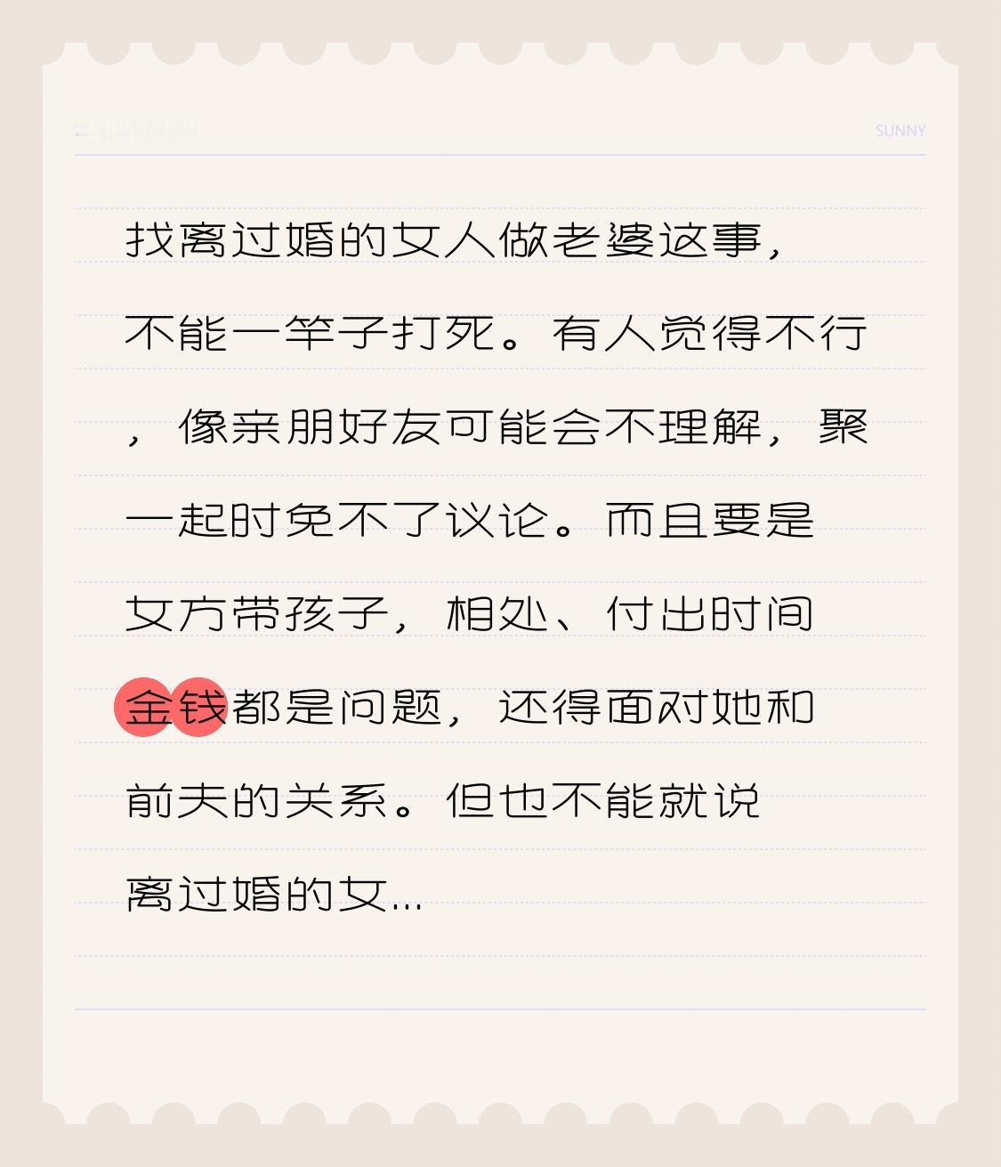 找离过婚的女人做老婆这事,不能一竿子打死。有人觉得不行,像亲朋好友可能会不理解,聚一起时免不了议论。而且要是女方带孩子,相处、付出时间金钱都是问题,还得面对她和前夫的关系。 但也不能就说离过婚的女人都不好。有些女人离婚是因为遇人不淑,经历过失败婚姻后,反而更懂得珍惜。她们会在新的感情里更成熟理智,也更明白自己想要什么。不能因为她们有过过去,就否定她们拥有幸福的权利。所以,找不找离过婚的女人做老婆,还是得看两人的感情和相处,不能被偏见左右。