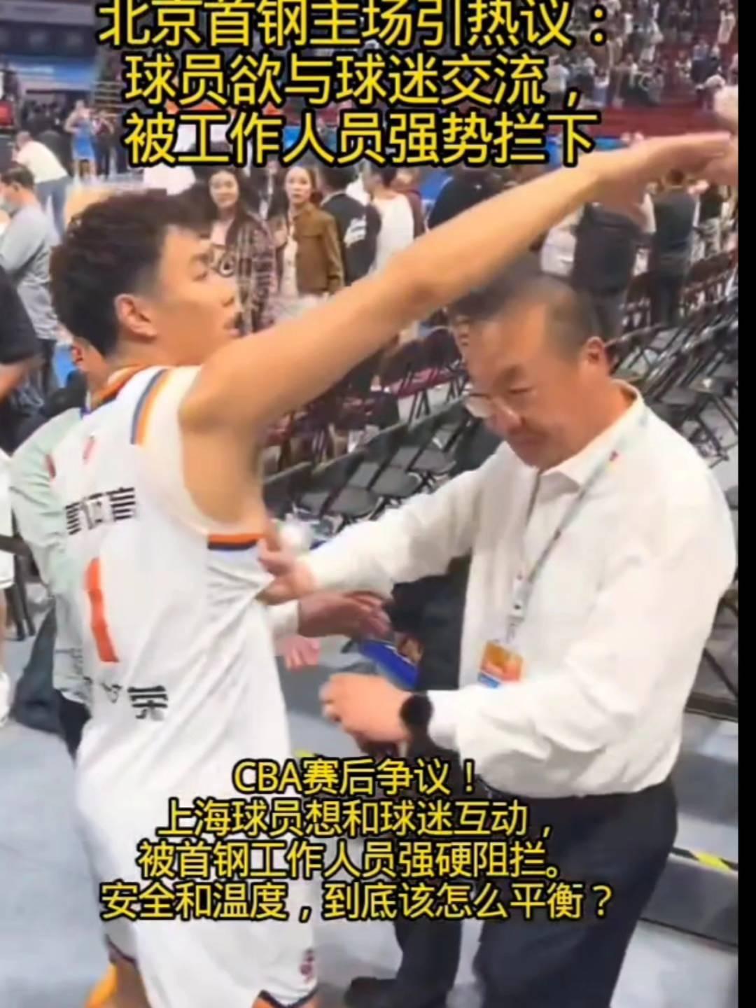 北京首钢主场引热议:球员欲与球迷交流,被工作人员强势拦下。 CBA赛后争议:上海球员想和球迷互动,被首钢工作人员强硬阻拦。安全和温度到底该怎么平衡?