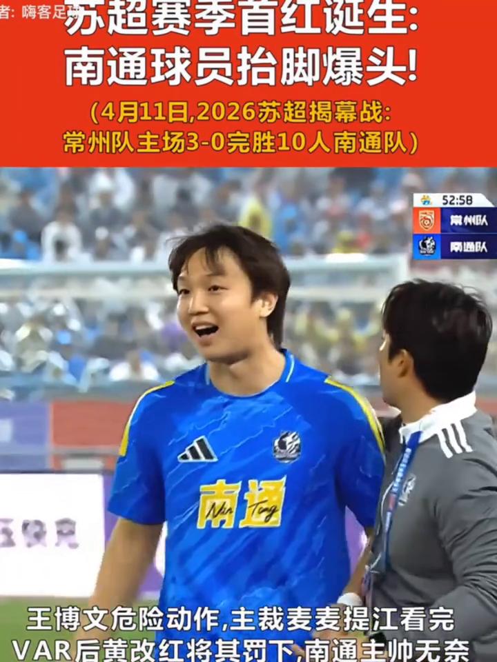 苏超赛季首红诞生:南通球员抬脚爆头! (4月11日,2026苏超揭幕战:常州队主场3-0完胜10人南通队)王博文危险动作,主裁麦麦提江看完VAR后黄改红将其罚下,南通主帅无奈。
