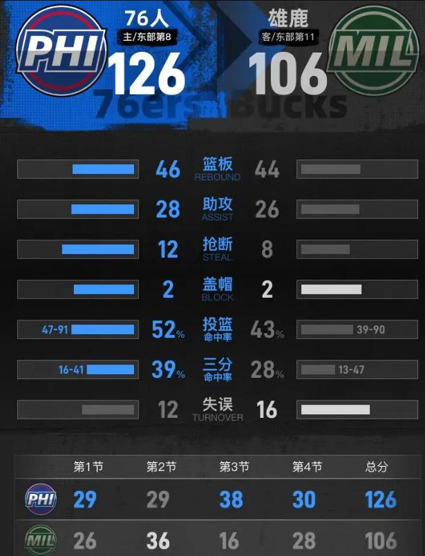 谁说巨星缺阵就是"青铜局"?2026年4月12日这场球,字母哥歇了,恩比德也歇了,本该是"菜鸡互啄",愣是打成了"血战钢锯岭"! 雄鹿半场还美滋滋领先4分呢,第三节突然"原地爆炸"——单节16比38,净输22分!从领先到落后18分,就一节球的功夫。这不是技术掉线,这是心态裸奔,是精神缺钙! 镜头切到第三节,那叫一个惨烈。76人这边,马克西跟踩着风火轮似的狂砍32分,乔治、乌布雷两翼齐飞,三分雨下得跟泼水节似的。最绝的是新秀VJ-埃奇库姆,16分9篮板5助攻,差点三双,把进攻梳理得跟德芙巧克力一样丝滑。 反观雄鹿,AJ-格林和科马克-瑞安数据看着挺美,但懂球的都懂,那叫"顺风刷分,逆风隐身"。一旦76人上强度,雄鹿立马进攻断电、防守漏勺,里弗斯在场边急得直跺脚,手里却捏不出一个能吼醒全队的人。 德拉蒙德在篮下把西姆斯教育得明明白白,12分11篮板,活脱脱一个"篮板怪兽"。恩比德不在?没关系,76人的体系照样转,人人敢打敢拼,这叫"冠军底蕴"。 这场球给咱上了一课:看球队成色,别看球星名片,看"裸泳"时的姿态。雄鹿没了字母哥,立马露出"伪强队"的底裤;76人没了大帝,马克西带队照样生龙活虎。 真正的强队,不是看巅峰时多风光,而是看绝境时有没有人敢站出来拍桌子。76人用这场20分大胜告诉全联盟:篮球是五个人的,精神头不能歇。这,才是篮球该有的硬气!