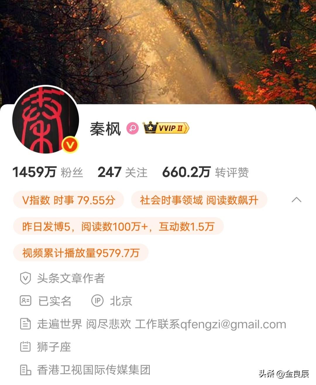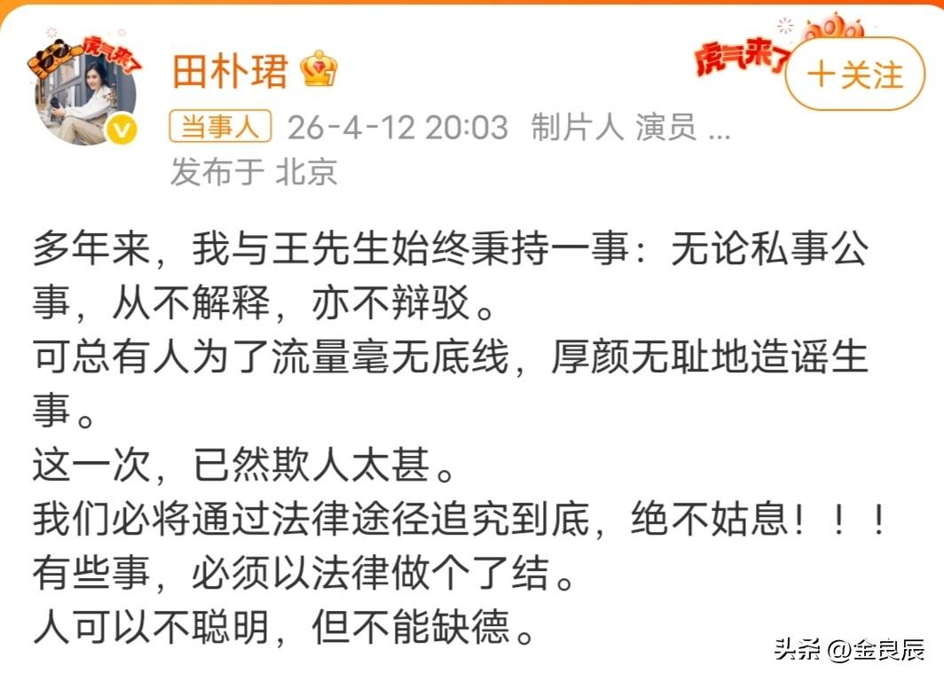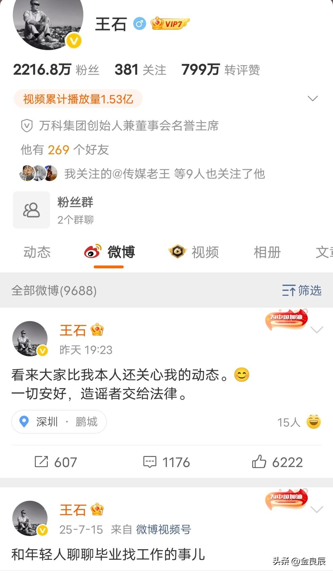 周末大瓜,今天还没落地! 4月12日下午17点55分,微博千万粉丝大V、前凤凰卫视记者秦枫在其账号爆料:王石被抓。 晚上19点23分,万科地产创始人王石的微博在广东深圳做出回应,发了一条信息:看来大家比我本人还关心我的动态。一切安好,造谣者交给法律。 值得关注的是,王石的这条微博回应距离他上一条微博内容发布时间(2025年7月15日)已经有9个月了,有网友猜测很可能不是王石本人发布。 紧接着,12日晚20点03分,王石的妻子田朴珺也在微博发文,暗指秦枫为了流量毫无底线、厚颜无耻地造谣,并表示将通过法律途径追究到底。这条微博发布地显示是北京。也就是说,王石夫妇俩4月12日不在一个居住地。 王石和田朴珺的辟谣微博发出不久,秦枫的“王石被抓”微博就删除了,而且后续几个小时还在不断发布国际信息,看起来没啥大事。 前媒体人怎么可能犯这么低级的错误?有网友扒了一下秦枫的简历背景,原来,她的祖父是新中国第一代外交官秦力真,姑父是前外交部长李肇星。