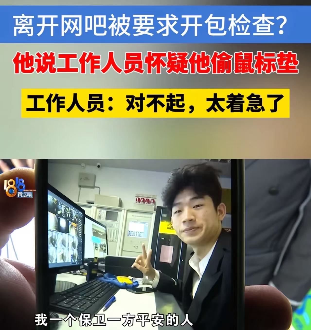 浙江杭州,“五星上将”保安,下班后去网吧上网,却被网吧老板质疑偷走鼠标垫,要求翻包检查!小伙:“作为保卫一方,防偷防盗的人,被质疑成小偷,实在是气不过!”