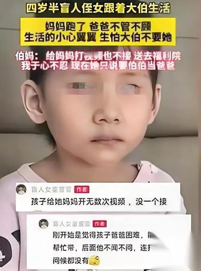 这个4岁盲童 被亲爸妈丢下 谁能想到,没血缘的两口子,才真给了她一个家。 刚到大伯家的时候,小姑娘怕得要命,吃饭不敢出声,走路贴着墙,听见大人说话大声点,就缩着身子说“我乖,我不闹”,还总摸索着帮大人干活,就怕再被赶一次。 大伯大妈自家条件一般,还有孩子要养,可从来没想过推开她。天不亮起来给她穿衣洗漱,一遍遍教她认路拿碗筷,为了圆孩子想妈妈的心愿,一天打几十个视频给亲妈,那头从来没接过。 我一直觉得,血缘从来不是亲情的标准答案,生而不养根本配不上“爸妈”这两个字,反而是这些没血缘的普通人,用善良给了孩子重新长大的底气。 你们遇到过这种血缘不如恩情的事吗?