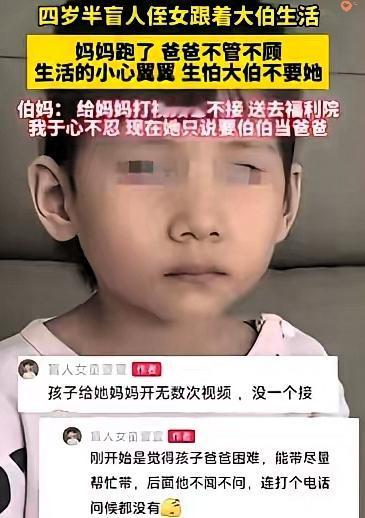有的人生了孩子,却不配为人父母,有的人没有血缘,却把孩子捧在手心里。 4岁半的盲童萱萱,从小就被命运狠狠亏待,妈妈在她三岁时离家出走,爸爸嫌麻烦直接把她丢给大伯,从此不闻不问。 孩子心里满是恐惧,做事小心翼翼,生怕连大伯大妈也抛弃自己,乖巧得让人心疼。 大伯一家本不富裕,却从没想过放弃她,伯妈细心照顾,一遍遍教她生活,还无数次拨通孩子亲妈的视频,只想让萱萱听听妈妈的声音,可电话那头始终无人回应。 血缘从不是衡量爱的标准,不负责任的父母,连陌生人都不如。 真正的家人,是愿意为你撑起一片天,在你最无助时紧紧拉住你的人。 看着这么懂事的孩子,你觉得亲生父母真的不会愧疚吗?