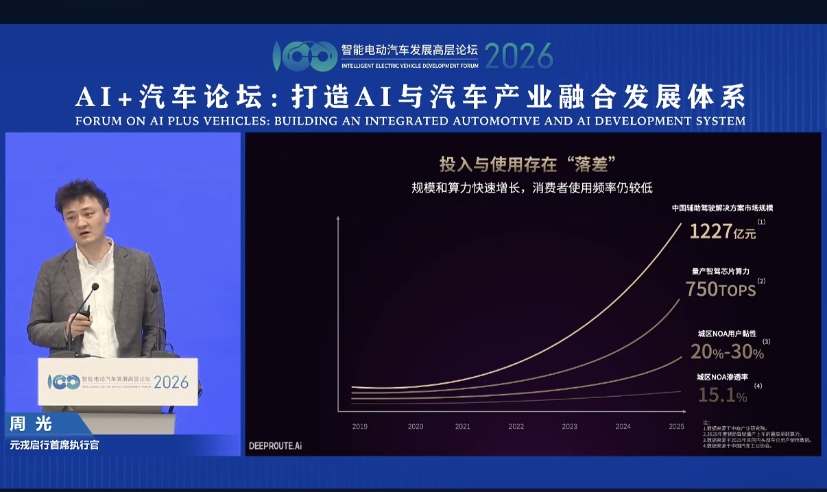 在4月11日召开的“AI+汽车论坛:打造AI与汽车产业融合发展体系”上,周光表示,目前中国辅助驾驶的痛点是投入与使用存在落差,中国辅助驾驶市场规模已经达到1227亿元,量产智驾芯片的算力最高达到750TOPS,但是城区辅助驾驶的使用率却不高,只有20%-30%,且城区渗透率仅有15.1%。同时周光指出,目前智驾芯片的750TOPS算力与100TOPS算力产生的效果并没有很大,这也是辅助驾驶算法需要提升的事。