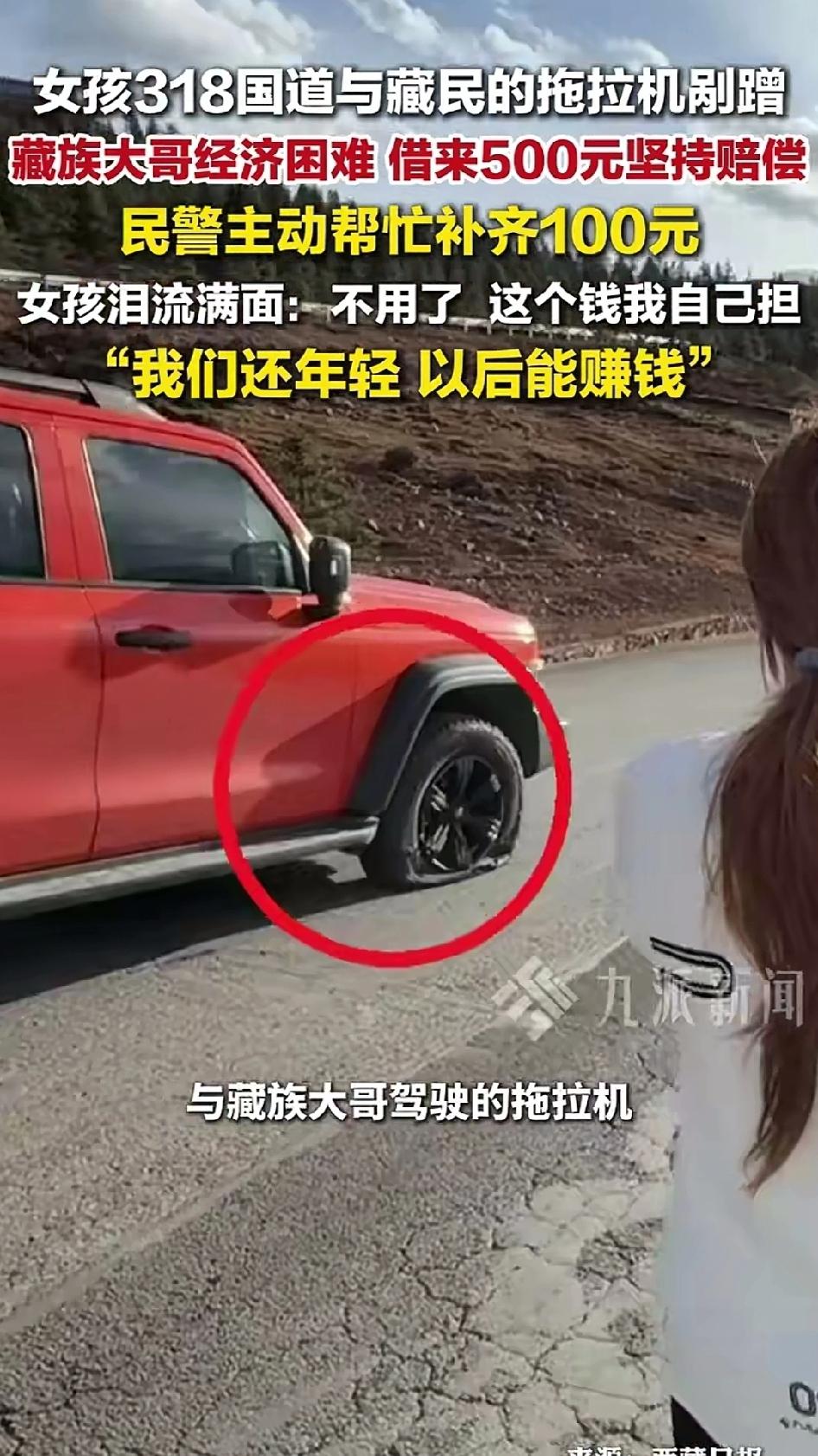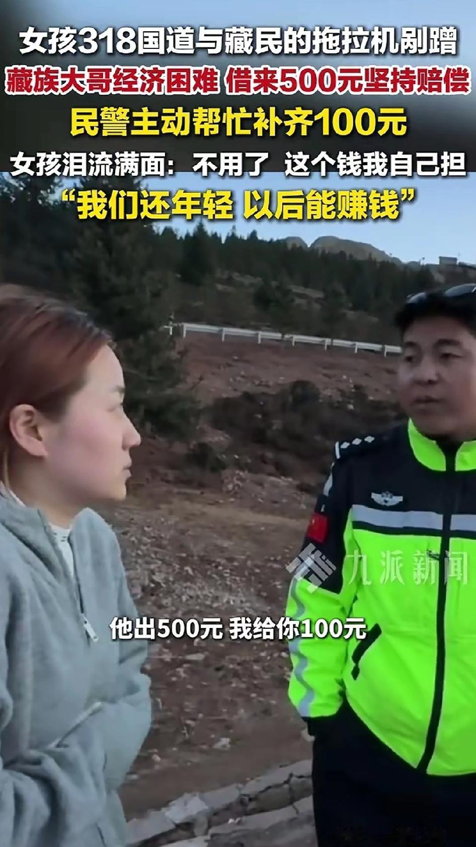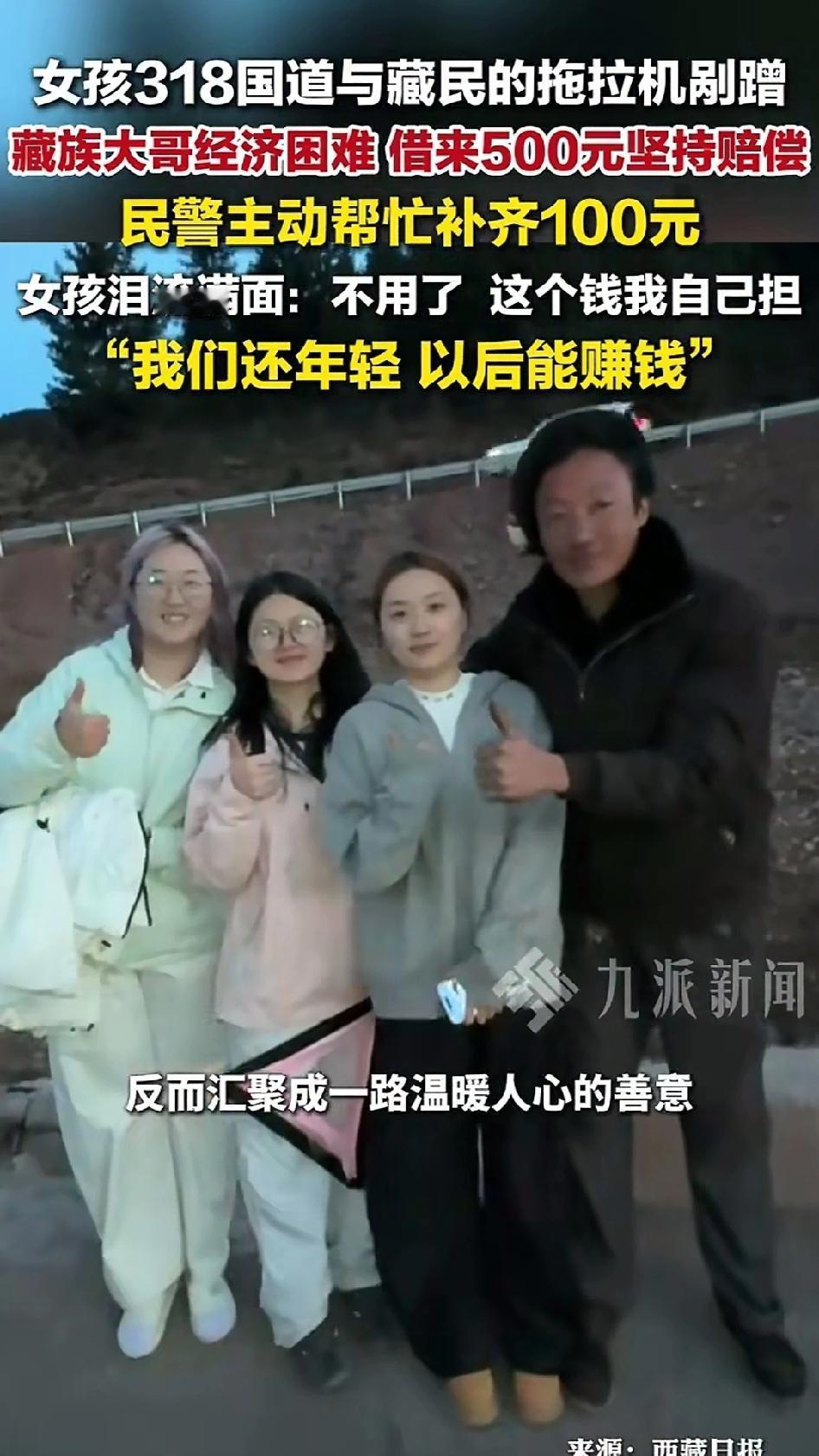 4月11日川藏线上,女子与藏族大哥的拖拉机发生剐蹭,交警判责任对半。大哥家境困难,借钱凑了500元,民警主动要掏100元帮他补齐。而女子得知后坚决不收,自己承担了全部维修费。这场事故没有争吵、没有讨价还价、没有满地狼藉。 女子的善良,是对穷苦人的怜悯,宁可自己承担损失,也不忍让大哥雪上加霜。大哥的善良,是“有错就要认”的淳朴认知,该赔的坚决要赔。交警的善良,既是对女子的认可,也是对大哥可贵担当精神的支持。 一场意外,照见了中华民族最朴素的品德:将心比心,互相体谅。