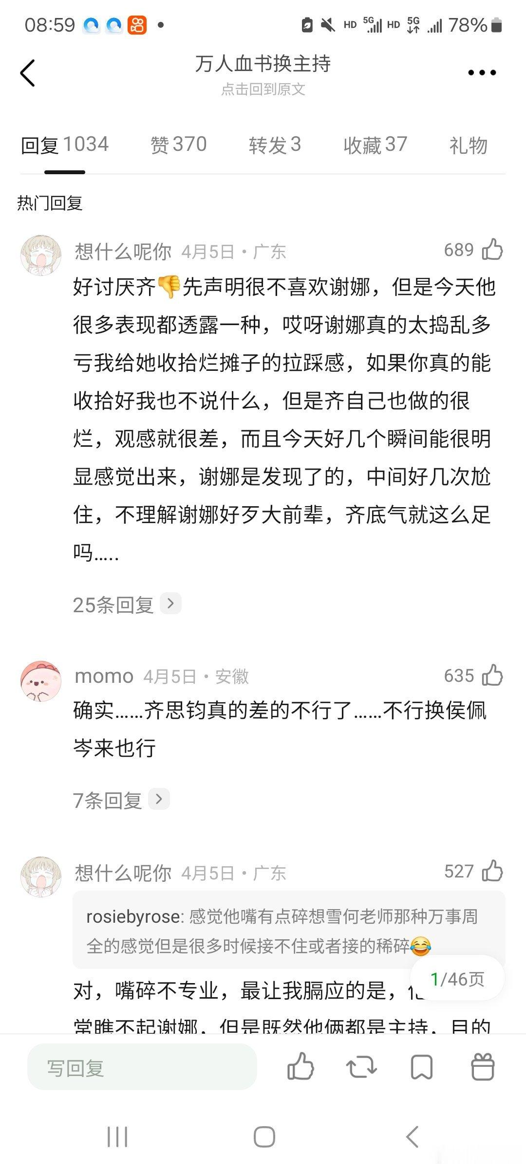 把浪花代表票数降为1意思一下点评一下耗一下时长差不多得了 齐能力实在太差了,ry去跪求何炅过来吧,歌手今年让汪涵去主持,何炅来就能控住谢娜,谢娜也不会觉得太浮躁,明明她很多时候是为了做效果,齐接不住就导致她很尴尬 不然就俩人一起换了,反正不要齐,换成两个女主持也行,评论区提名的沈梦辰李莎旻子谭薇曹颖都行