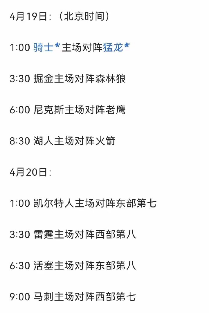 调好闹钟,季后赛首轮赛程公布!“火湖大战”上午8点开打,时间最佳!马刺比赛上午9点,看完正好吃午饭!骑士、雷霆、掘金、凯尔特人得熬夜看,特别是骑士首场凌晨1点,不太友好!nbanba季后赛