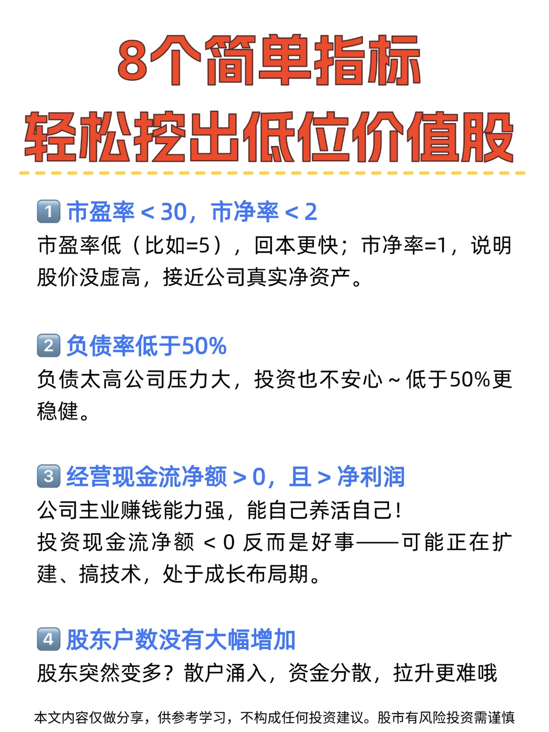 ◦ 市盈率(比如=5),脑子里就想成“回本年限”。投5块,它一年能帮你赚回1块,5年回本。数越小,回本越快,越划算。
