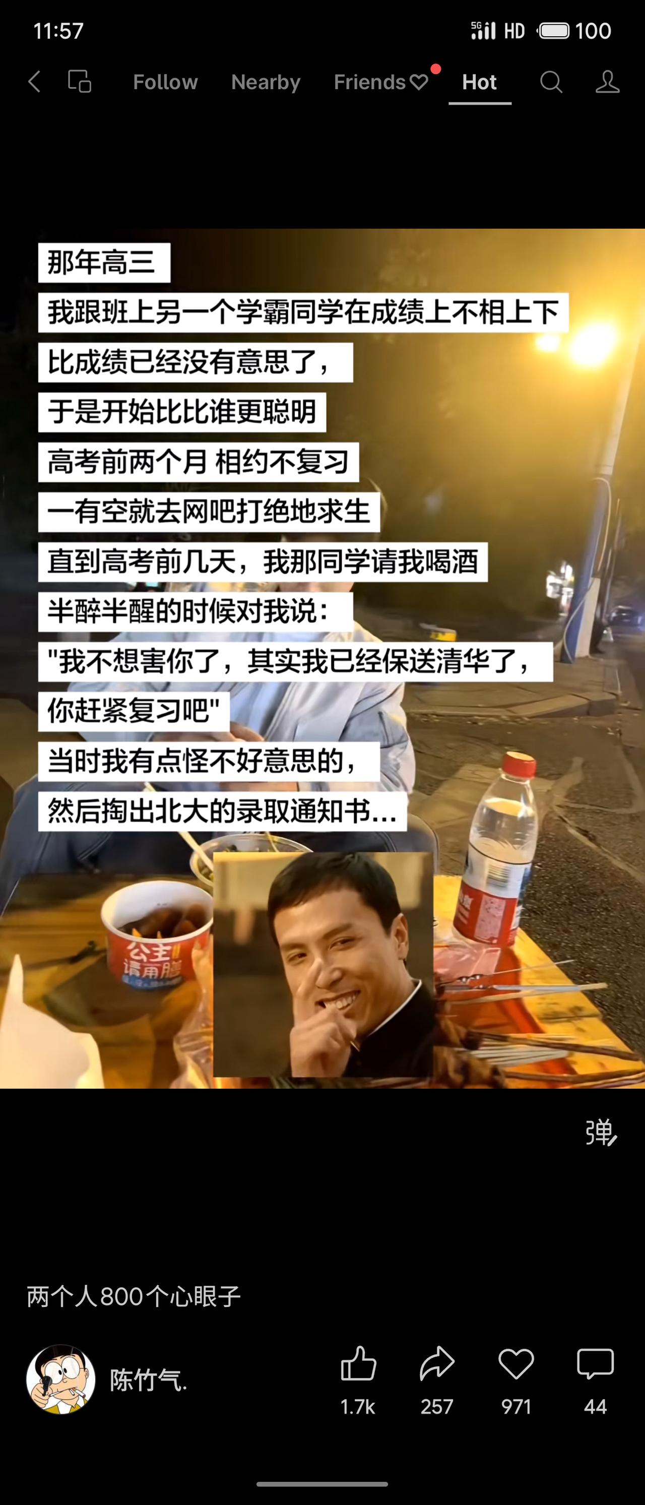 高三两位学霸竞争,相约考前两个月不复习,天天去网吧打游戏。临考几天,一位请另一位喝酒,坦白自己已保送清华,劝对方赶紧复习。结果对方掏出北大录取通知书——两人都在演。