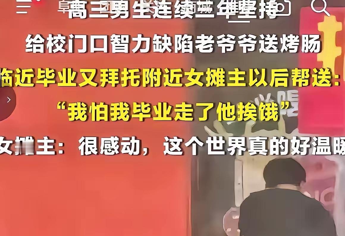破防了!山东潍坊一个高三男生,默默给校门口智力缺陷的老爷爷送了3年烤肠,毕业前怕爷爷挨饿,请求摊主接力。 一根烤肠三块钱,我算了笔账——三年,一千多个日夜,这不是一笔小数目。这个年龄的孩子零花钱本就不多,他却每天雷打不动留出一份。刮风下雨,酷暑寒冬,从没断过。附近的女摊主管女士说,其实周围的商贩平时也会给老爷爷拿点吃的,但谁也没想到,这个看起来不善言辞的男孩,一个人默默坚持了三年之久。 了解完整件事的细节后,心里的暖意一直散不去。这个高三男生,每天埋在习题和试卷里,生活被早读、晚自习填得满满当当,自己尚且处在需要被家人照顾的年纪,却把一份细碎的温柔,稳稳递到了一个素不相识的老人手上。 他的零花钱大多来自父母给的餐费和零星补贴,三块钱放在当下,不够买一杯奶茶,不够买一支笔芯,却是他每天固定要为老人预留的支出。他从不会在同学面前张扬这件事,也不会对着老人刻意表现自己的好心,只是每天放学路过摊位时,安静买下一根烤肠,快步走到老人身边递过去。 老人有智力缺陷,没办法清晰表达感谢,甚至记不住这个常年给他送吃的孩子长什么样子,只会在拿到烤肠时,露出憨厚又满足的神情。对老人而言,这根温热的烤肠,是日复一日的果腹依靠,是街头流浪时少有的温暖,对男生来说,这只是顺手而为的小事,却坚持了整整三个春秋。 潍坊的冬天寒风刺骨,夏天闷热难耐,恶劣天气里,校门口的人流会少很多,男生依旧没有中断这份约定。下雨时他撑着伞跑向摊位,雪天里踩着积雪快步上前,哪怕学业再紧张,晚自习再晚,他都记得给老人带一根烤肠。 周边的商贩看在眼里,大多只是偶尔给老人递些馒头、小吃,毕竟大家做生意忙碌,很难做到日日不落。正是这份对比,才更显出男生的难得,他没有因为别人做得少就放弃,也没有因为时间久了就懈怠,少年人的善良没有杂质,认准了要做的事,就安安静静坚持到底。 真正让人鼻酸的,是男生毕业前的那个请求。他知道自己即将离开校园,奔赴考场,开启新的人生阶段,没办法再每天出现在校门口。他特意找到摊主管女士,语气带着不舍和担忧,只希望摊主能在自己离开后,偶尔多照看一下老人,不用花费太多,只要能让老人不至于挨饿就好。 一个十几岁的孩子,在告别自己高中生涯的重要时刻,心里牵挂的不是毕业旅行,不是未来的大学生活,而是一个无亲无故的流浪老人。他没有要求别人必须承担什么,只是带着恳求的心意,希望自己守护了三年的人,能继续被世界温柔以待。 摊主当场就红了眼眶,当即答应了男生的请求。周围的商贩得知后,也纷纷加入进来,大家约定好,轮流给老人准备吃食,让这份温暖不会因为男孩的离开而中断。一根烤肠的善意,从一个少年的坚持,变成了一群人的默契接力。 我们总在感慨世间凉薄,却常常忽略,最动人的温暖从来都藏在市井街头。它不需要巨额的捐赠,不需要高调的宣扬,只是一个普通人对另一个普通人的牵挂,一个少年对陌生弱者的体恤。 这个男生用三年的时光告诉所有人,善良与年龄无关,与财富无关,只与本心有关。他用微不足道的三块钱,撑起了老人三年的温饱,也用最纯粹的行动,诠释了少年该有的模样。 平凡的善举最有力量,细碎的温柔最能治愈人心。少年已奔赴前程,而他留下的温暖,还在潍坊的校门口继续延续,这便是人间最值得的美好。 各位读者你们怎么看?欢迎在评论区讨论。