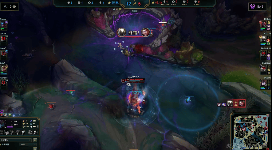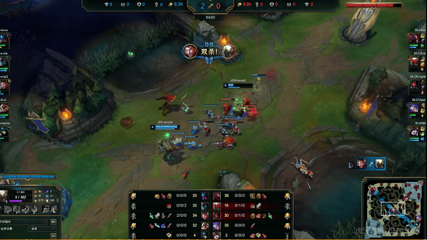 8分钟:Junjia大树游走下路配合自家双人组击杀对方下野辅打出零换三