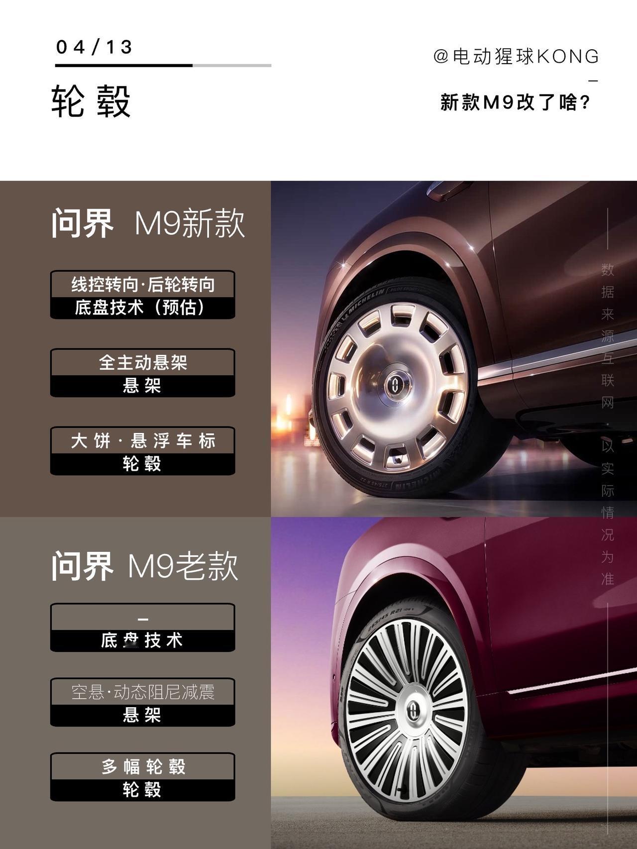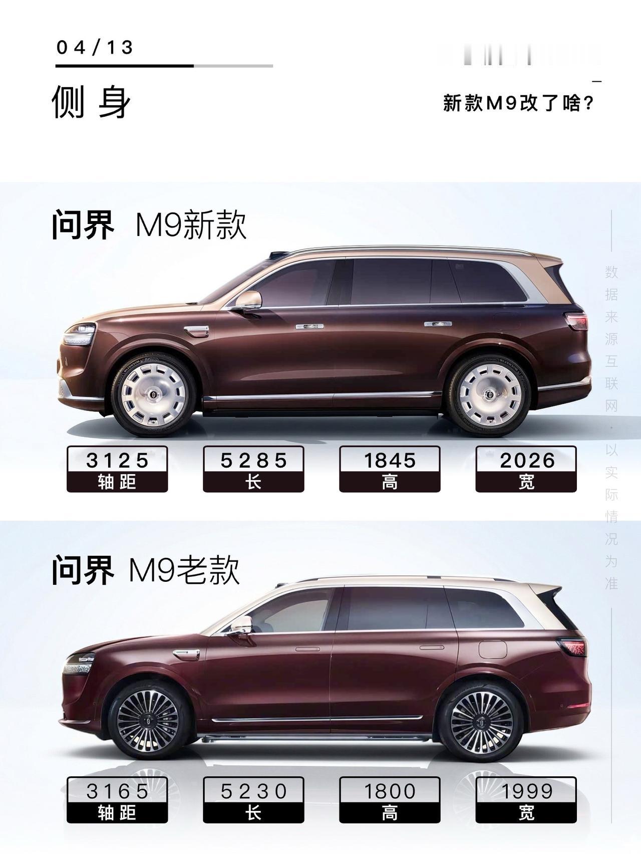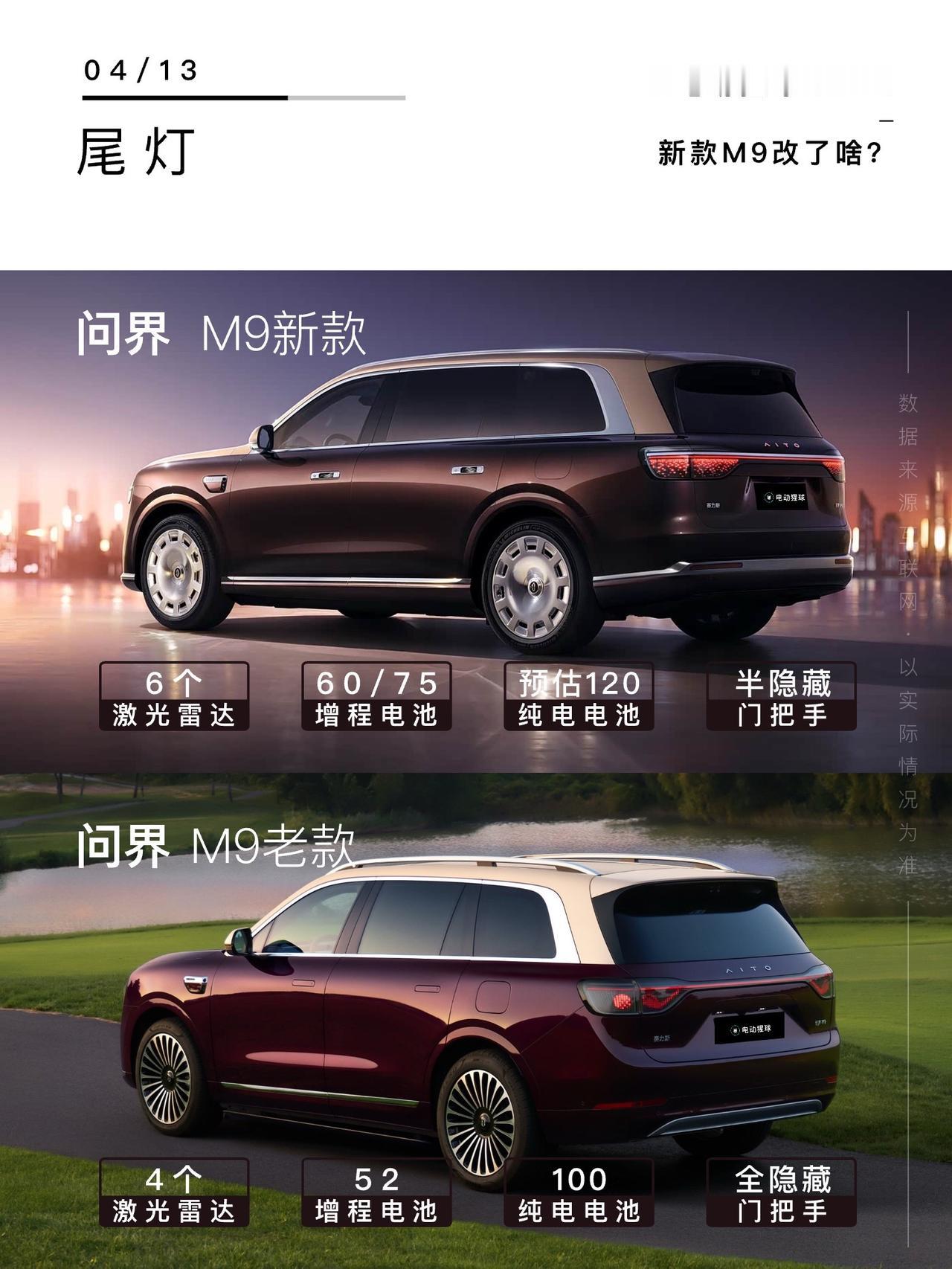 问界新款M9公布,尺寸提升,前脸下方和尾部微调,半隐藏门把手和大饼轮毂终于来了,登味儿更足了。这次不挤牙膏了配置提升挺大的,手握50几个W,你会等新款还是提老款?问界M9