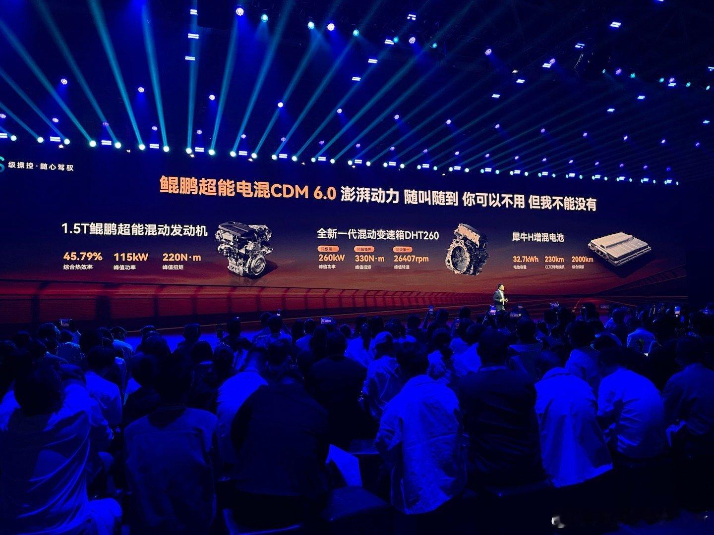 搭载鲲鹏超能电混 CDM6.0,犀牛 H 增混电池,以及飞鱼底盘、雪豹四驱,官方称实测油耗 3.3L,续航达到 2119km,零百加速 4.83s