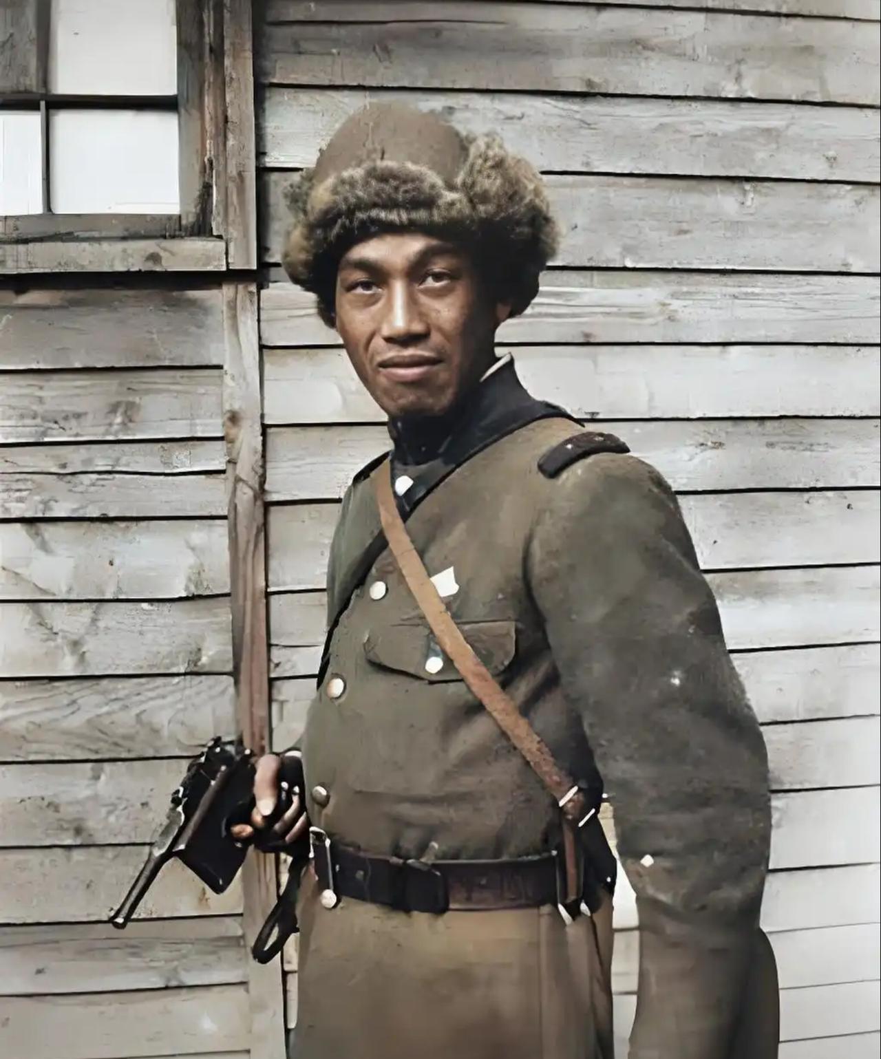 这张照片拍摄于抗战时期的中国东北(伪满洲国),木质房屋、棉帽是东北冬季的典型特征,照片中的日军手持的是毛瑟C96手枪,在中国俗称“驳壳枪/盒子炮”,本是中国军队的主流配枪,日军多为战场缴获后使用。