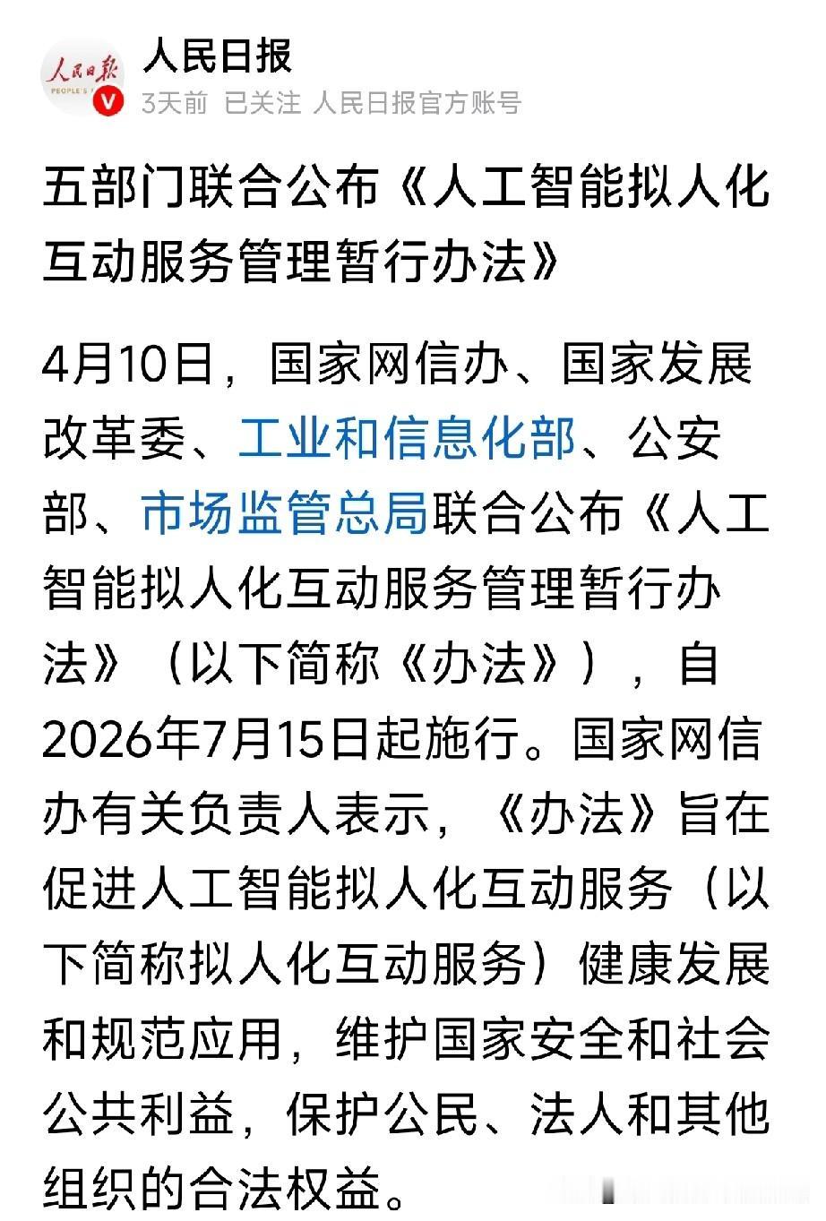 五部门重磅新规!7月15日起,禁止向未成年人提供AI虚拟伴侣服务 国家网信办、发改委、工信部等五部门联合发布《人工智能拟人化互动服务管理暂行办法》,2026年7月15日正式施行。 AI能陪人聊天,但不能随便当“虚拟伴侣”,尤其对未成年人,划出硬红线! 四大红线,一看就懂 ✅ 未成年人:禁止使用虚拟亲属、虚拟伴侣类AI服务; ✅ 适老服务:必须显著提示风险,给予使用指导; ❌ 严禁:诱导沉迷、情感操纵、语言暴力、自残暗示; ✅ 平台合规:安全评估、算法备案、沙箱安全平台缺一不可。 鼓励方向:适老陪伴、适幼照护、文化传播、特殊人群支持。 新规不是叫停AI,而是守护安全、规范发展。 您怎么看AI情感陪伴?评论区聊聊。 网络安全AI新规 虚拟伴侣 未成年人保护 人工智能