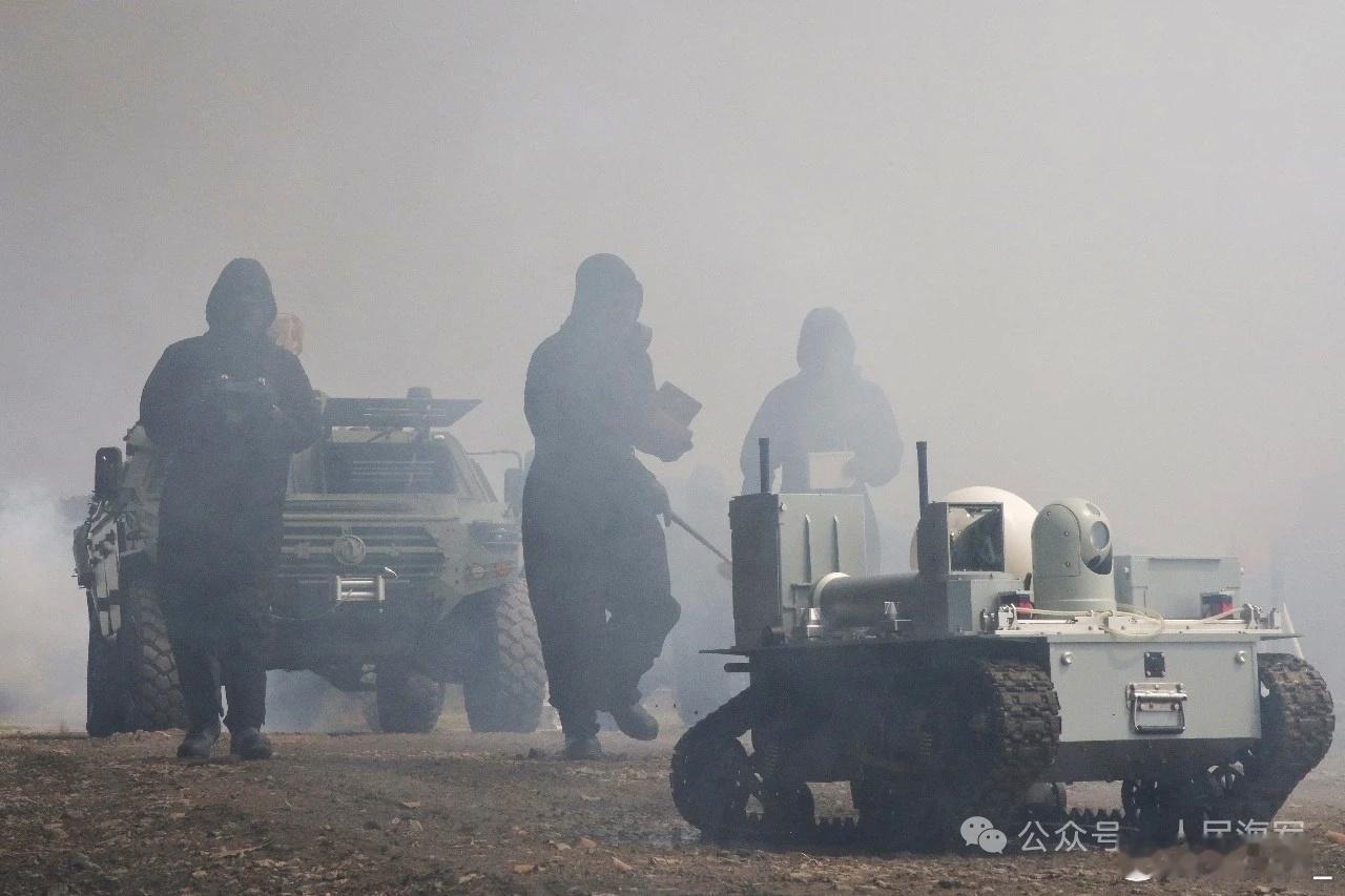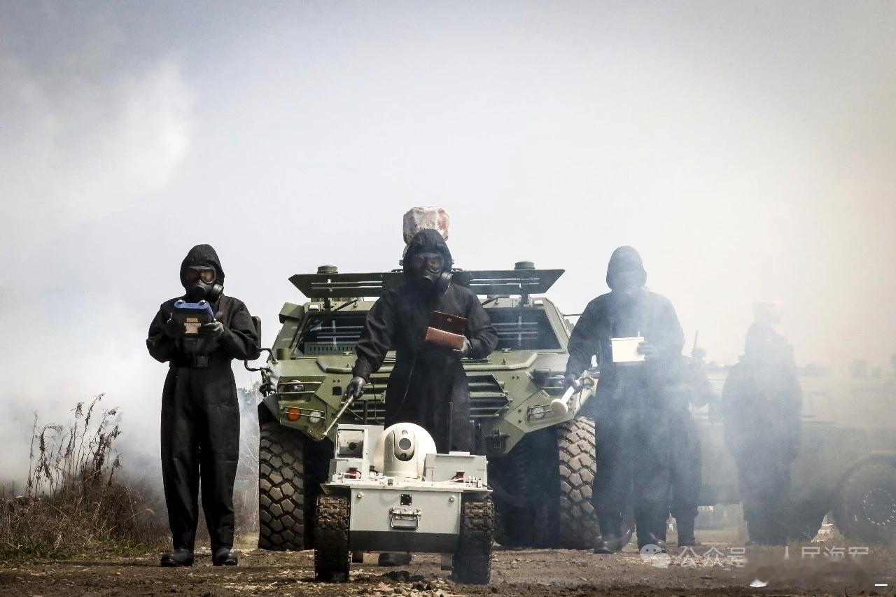 东海防化分队应急处突训练,无人机抵达现场后,划定辐射沾染地域,建立安全封控区、展