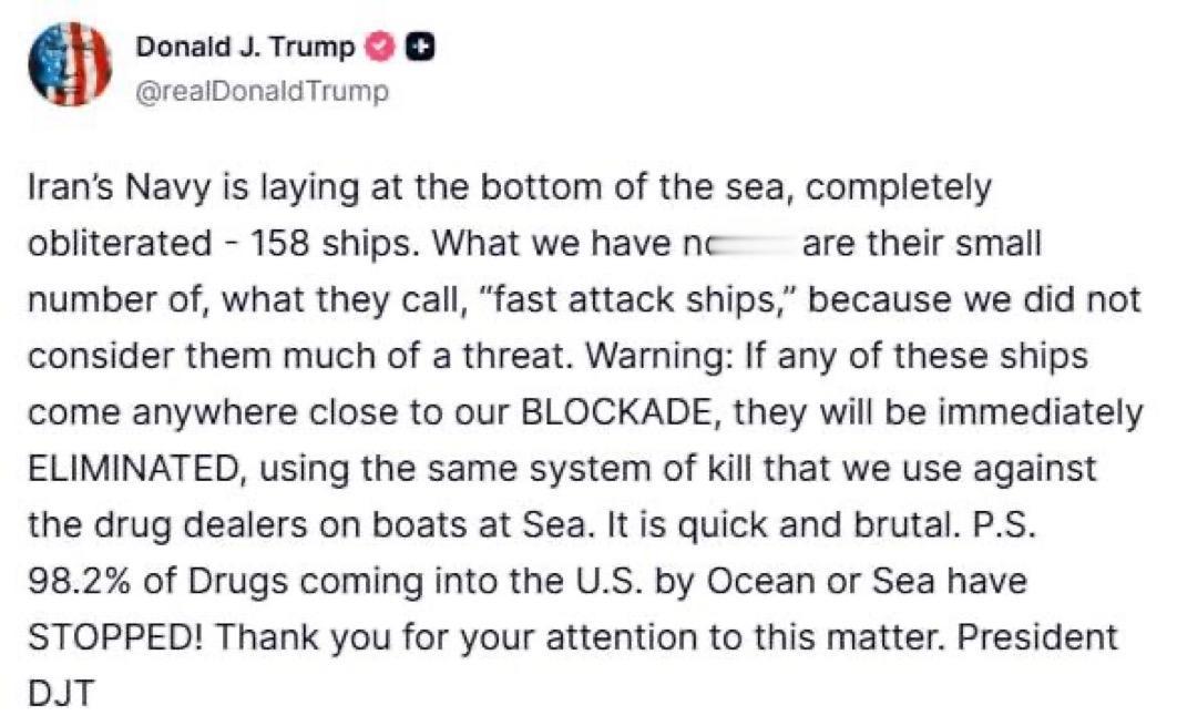 特朗普:“伊朗海军已沉入海底,完全被摧毁——158艘舰艇。我们尚未打击的是它们少量的、他们称之为‘快速攻击舰’的船只,因为我们认为它们威胁不大。 警告:如果这些船只中的任何一艘靠近我们的封锁线,它们将被立即消灭,使用我们对付海上贩毒船只的相同杀伤系统。它快速而残酷。 附言:98.2%的通过海洋或海路进入美国的毒品已停止!”