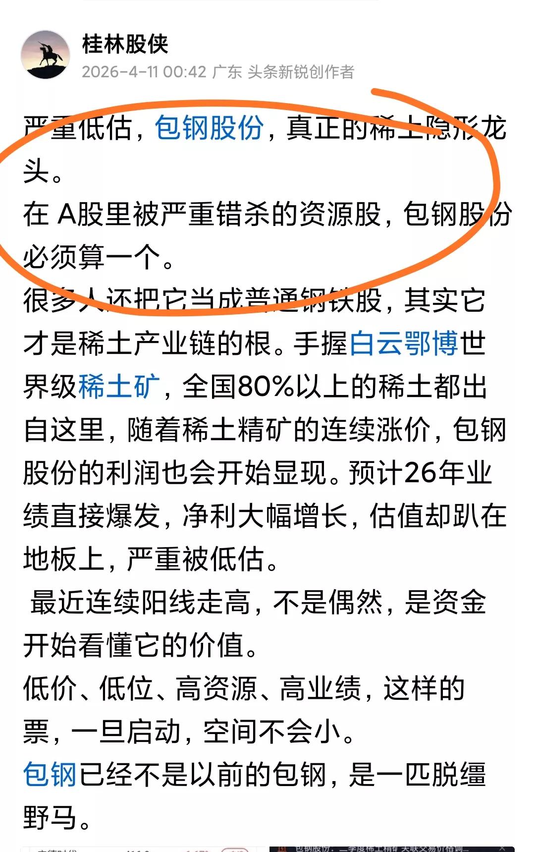 严重低估的包钢股份即将再创新高? 包钢现在的股价其实就是普通钢铁股的价格,但是人家可是矿资源最丰富的公司啊,人家80%的利润可都来自稀土。稀土精矿已经连续7季提价,机构预测今年净利润达到200%左右。 前两天还在跟朋友聊包钢,说它低估它潜力巨大。从市场行情看,稀土的价值越来越凸显,(新能源+风电爆发,市场供不应求)包钢握有这么大比例的稀土利润,再创历史新高不是没可能。 想象一下,一旦市场真正认识到它的价值,你觉的还会是现在的白菜价吗?会不会直接一飞冲天呢?