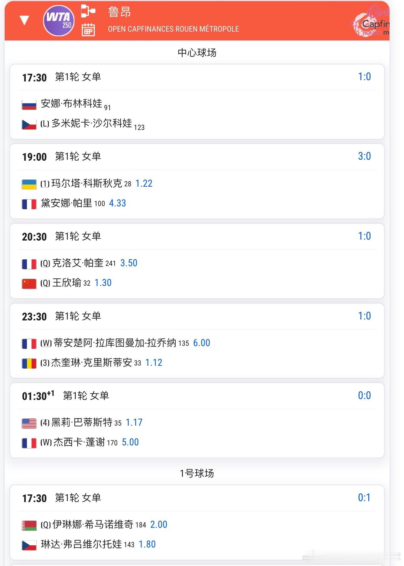 WTA鲁昂不早于20:30王欣瑜🇨🇳vs帕奎🇫🇷
