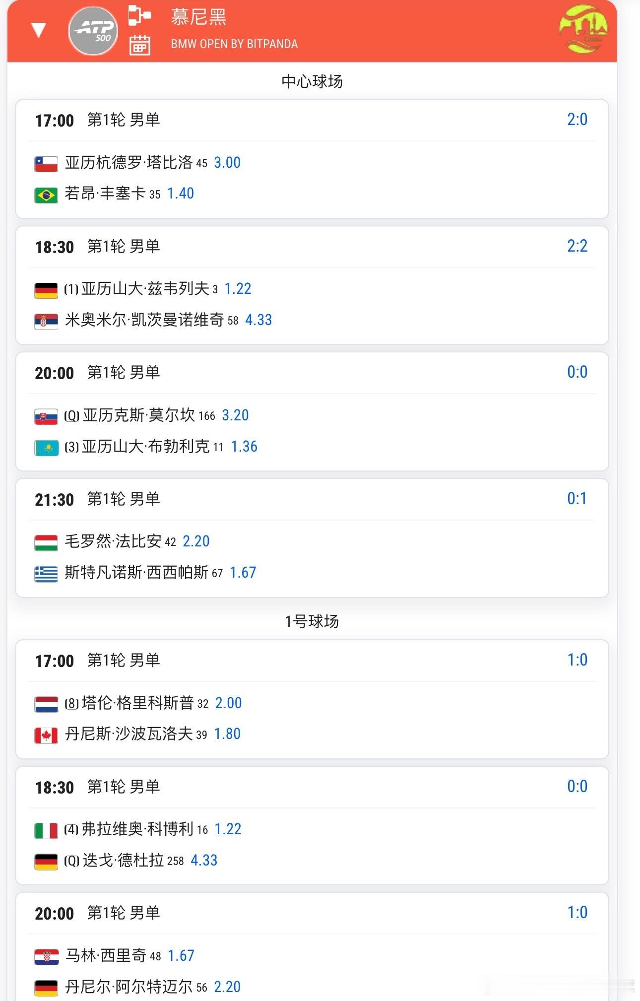 ATP慕尼黑中心场兹维列夫🇩🇪vs凯兹曼诺维奇🇷🇸2号球场 17点张之臻🇨🇳vs达尔德里🇮🇹