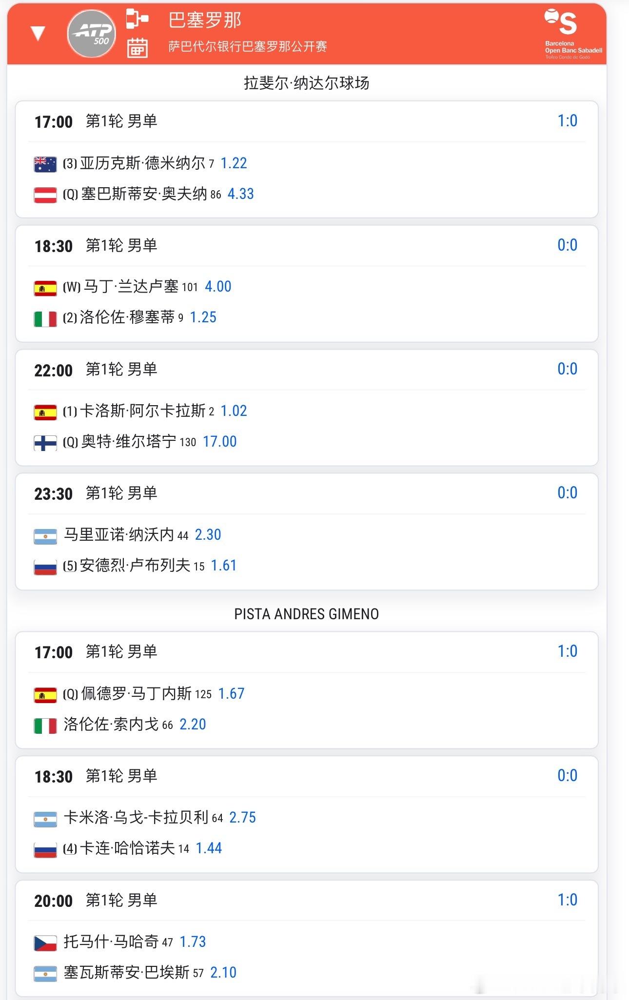 ATP巴塞罗那 纳达尔球场22点 阿尔卡拉斯🇪🇸vs维尔塔宁🇫🇮
