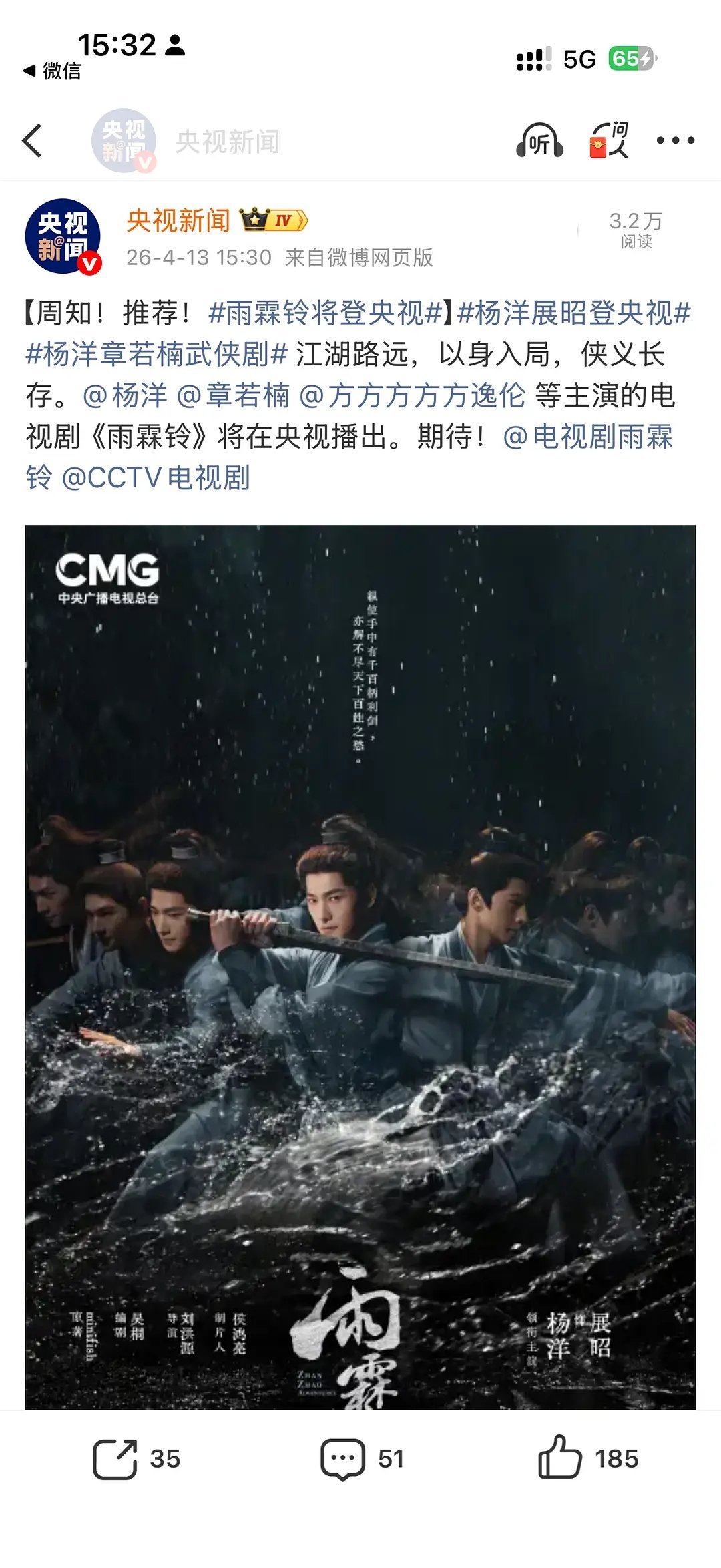 杨洋《雨霖铃》即将登陆央视了?那应该不会很难看。