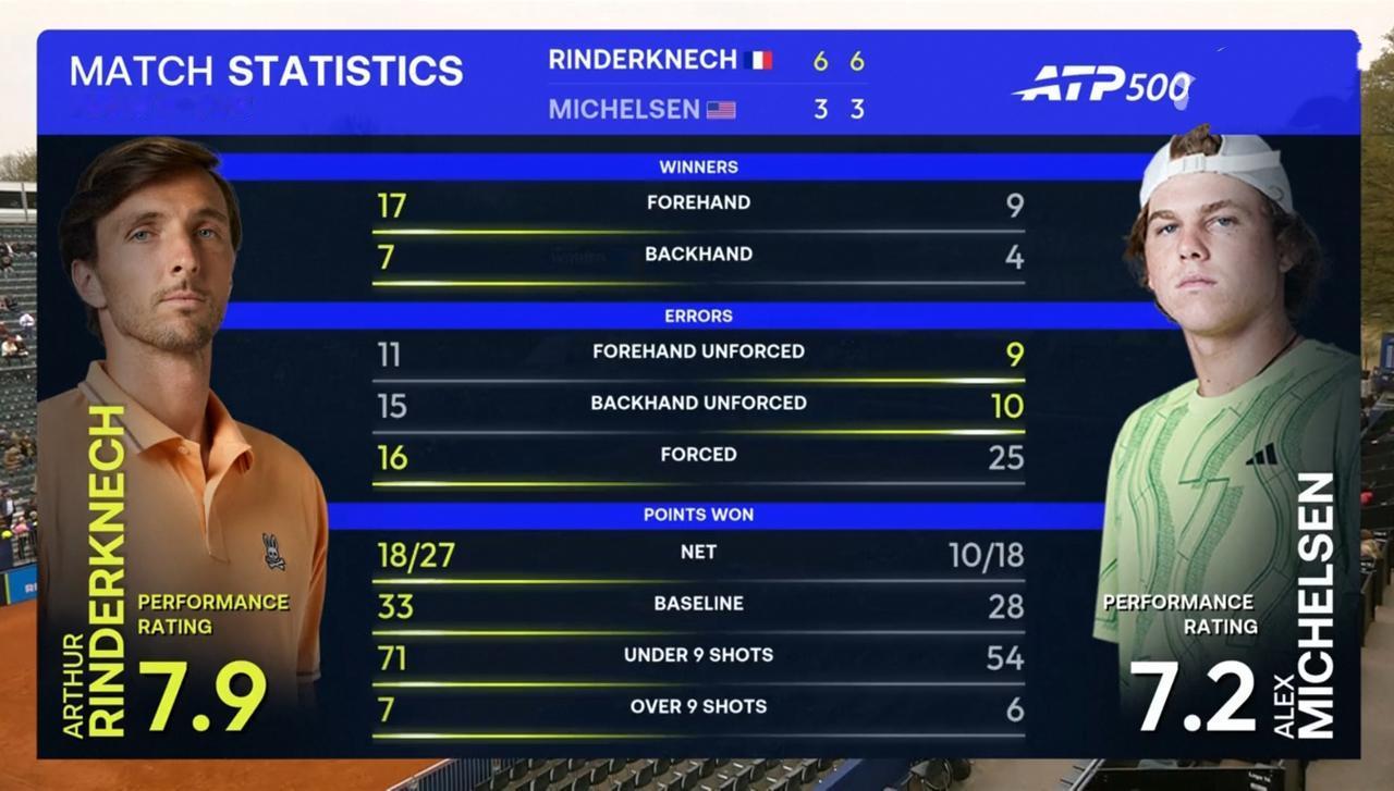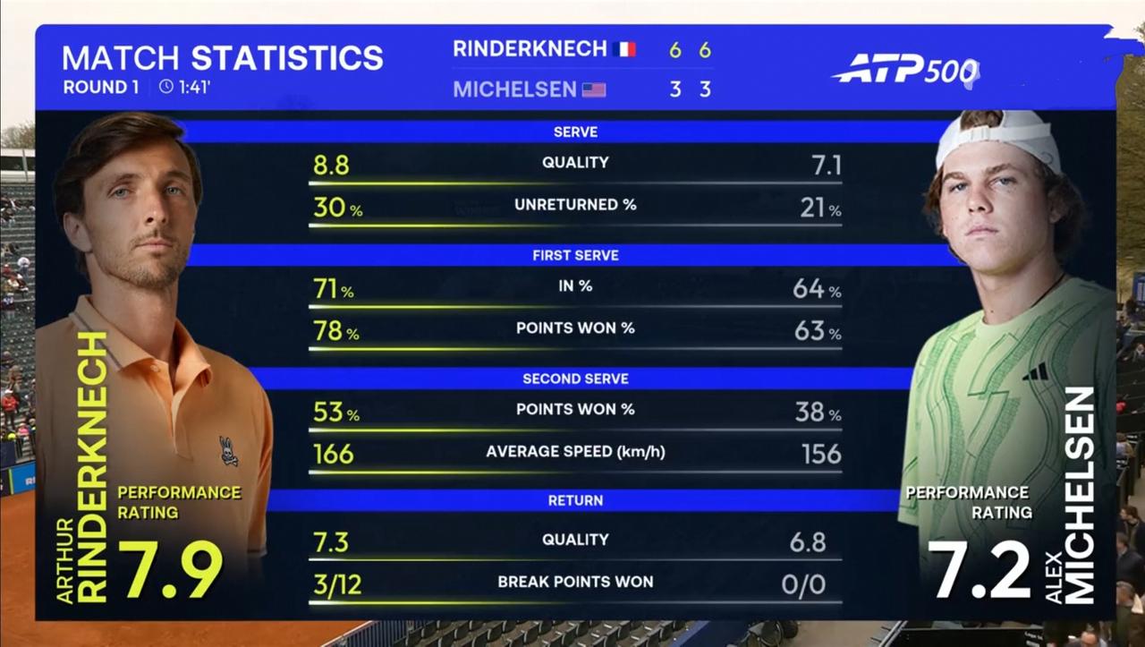 表哥林德克内希ATP500慕尼黑站第一轮完胜米克尔森 北京时间2026年4月13日下午,ATP500慕尼黑站第一轮,表哥林德克内希与美国新秀米克尔森隔网相对。 结果,耗时1小时41分钟,表哥林德克内希以2:0的比分完胜米克尔森。 具体比分为两个6:3。 整场比赛,表哥林德克内希共轰出3记ACE,与对手持平;发出2个双误,比对手少5个;一发得分率高达78.05%,比对手高出15个多百分点;二发得分率52.94%,比对手高出15个百分点;共拿到12个破发点,比对手多12个;成功破发2次,比对手多2次;总得分78分,比对手多18分。 自从2025上海大师赛表弟瓦舍罗与表哥林德克内希联手掀起黑马风暴分获冠亚军后,就引起球迷高度关注,兄弟俩也没有令人失望,他们表现不俗。 期待表哥林德克内希有更加出色的表现。