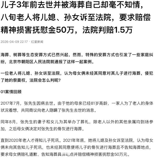 北京朝阳,一位81岁的老太被全家瞒了整整了年,才知道自己的亲生儿子早就因病去世甚至连骨灰都被儿媳和孙女撒进了大海,愤怒的老太将母女俩告上法庭,要求赔礼道歉、告知海葬地点并索要50万元精神损害抚慰金,法院一审理,判决结果却出人意料。 北京朝阳区一位81岁的老太,因年事已高、身体欠佳,家人担心她承受不了白发人送黑发人的打击,便一起商议隐瞒了其儿子病逝的消息,2017年7月老太的儿子张某因病离世。 当时老太已是81岁高龄,妻子黄某与女儿小张担心老人得知噩耗后急火攻心、危及健康,便联合其他亲属一同隐瞒,对外只说张某外出工作或长期在外,日常也刻意回避相关话题,维持着老人心中儿子仍在世的假象。 同年8月黄某和小张为张某举办了仅有部分亲属参与的葬礼,全程未让老太知晓,葬礼结束后,母女俩考虑到海葬是国家倡导的节地生态安葬方式,也符合张某生前的部分意愿,便在2018年9月租赁快艇,将张某的骨灰撒入大海完成海葬。 此后的三年多时间里,母女俩和其他亲属始终守着这个秘密,日常与老太相处时小心翼翼,从未透露过半分,老太也一直被蒙在鼓里,始终以为儿子只是远在外地、无法常归。 直到2020年老太在与亲友的偶然交谈中,逐渐察觉出异样,反复追问下才得知残酷真相——自己的亲生儿子早已去世三年,连骨灰都已被儿媳和孙女撒进大海,自己连儿子最后一面都没见到,连祭奠儿子的地方都无从知晓。 得知真相的老太悲痛欲绝、愤怒不已,她认为儿媳和孙女不仅长期隐瞒死讯,还擅自决定海葬、拒绝告知海葬地点,彻底剥夺了她作为母亲送别儿子、祭奠儿子的权利,给她造成了难以弥补的精神伤害。 2021年年底老太一纸诉状将儿媳黄某和孙女小张告上北京市朝阳区人民法院,提出三项诉求:一是要求母女俩向自己赔礼道歉,二是告知儿子骨灰海葬的具体地点;三是索要50万元的精神损害抚慰金,以此弥补自己多年被隐瞒、无法尽母亲最后心意的精神损失。 案件审理过程中,儿媳和孙女辩称,隐瞒死讯完全是出于善意,担心高龄老太身体承受不住打击,海葬也是符合国家生态安葬倡导的合法方式,并非刻意侵害老人权益。 法院经审理后认为,母女俩隐瞒张某死讯的初衷确为善意,是基于对老人身体健康的合理担忧,行为合乎情理,同时海葬作为绿色生态安葬形式受社会鼓励。 母女俩作为张某的亲密共居人,有权选择该安葬方式,海葬行为本身并未构成对老太祭奠权的侵害,法院同时指出,2020年老太得知真相后,母女俩仍长期拒绝告知海葬的具体信息,导致老太无法正常祭奠儿子,这一行为确实侵犯了老太作为母亲平等享有的祭奠权,给其造成了一定的精神损害。 综合案件事实、双方亲情关系及损害程度,法院最终作出判决:驳回老太要求赔礼道歉和告知海葬具体地点的诉求,酌情判令儿媳和孙女赔偿老太精神损害抚慰金1.5万元,判决作出后双方均未提起上诉,这起因亲情隐瞒与祭奠权引发的家庭纠纷,最终以这样的结果落下帷幕。