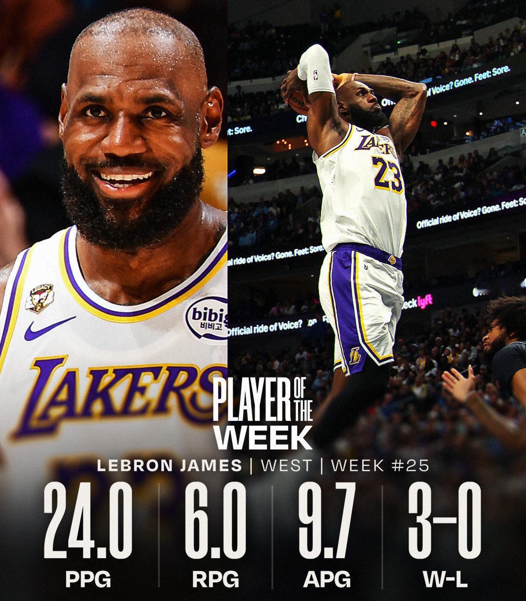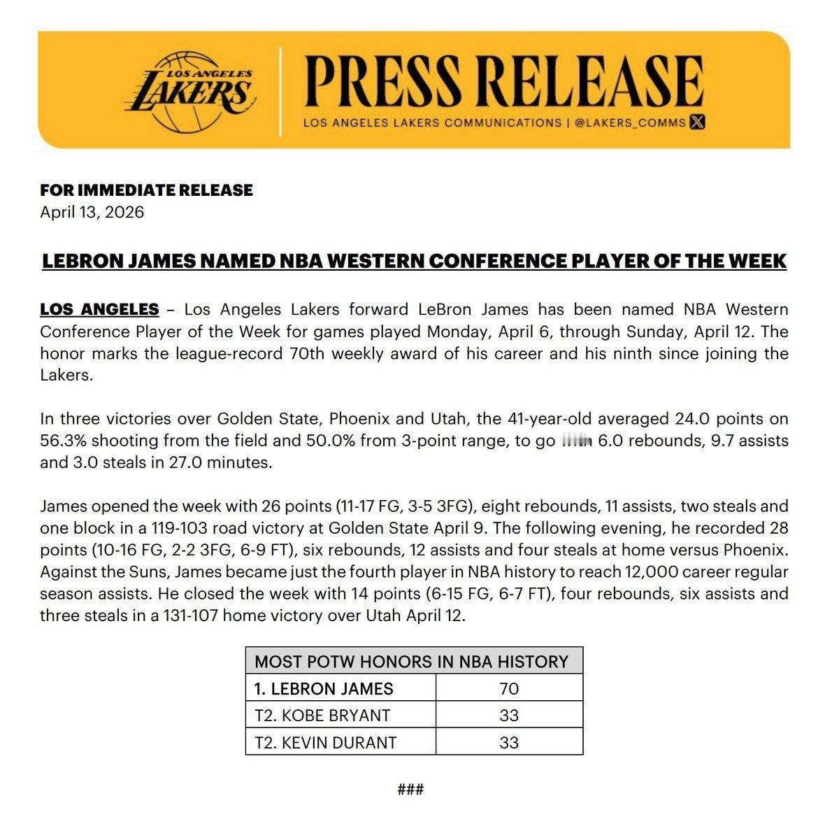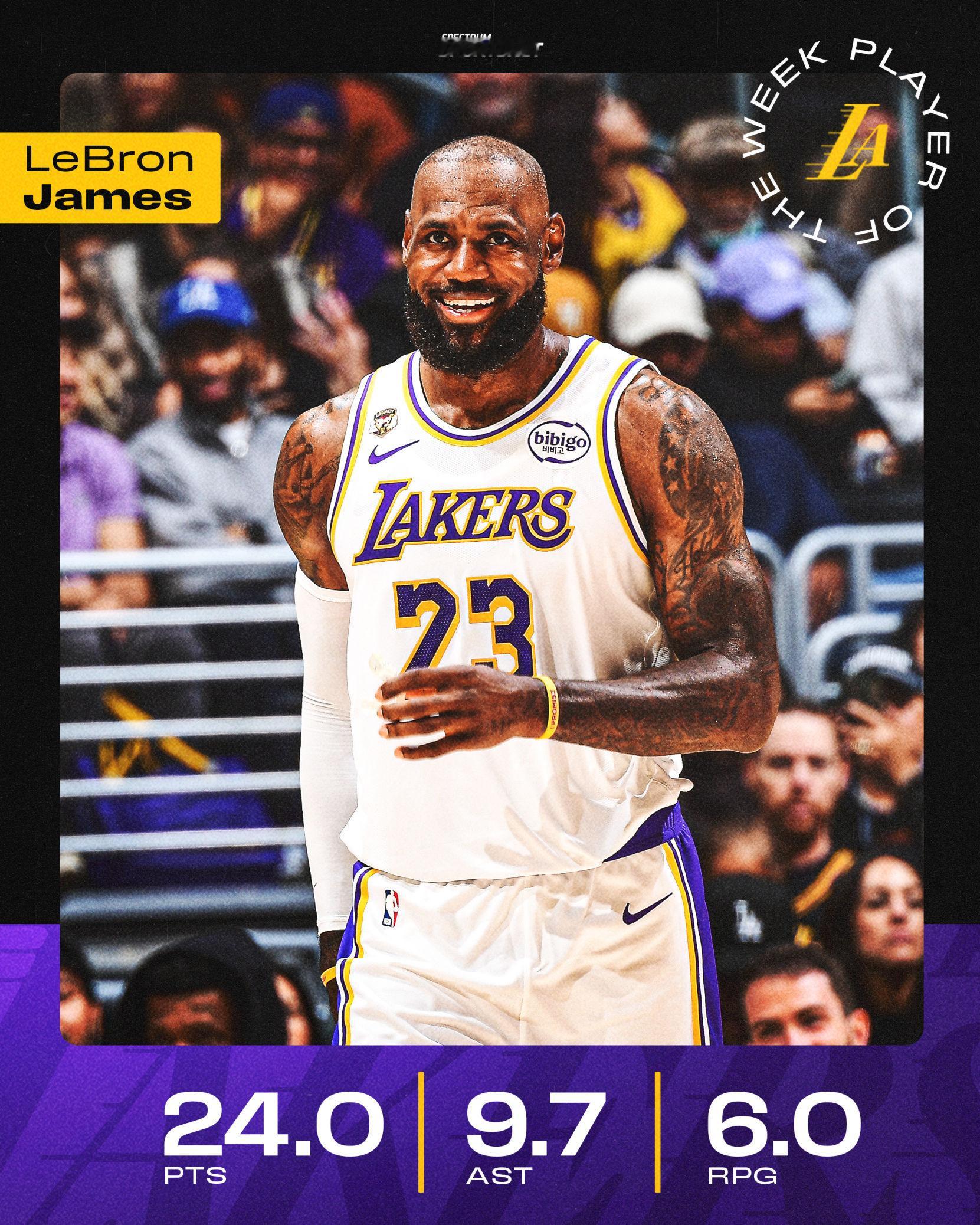 恭喜老詹荣获常规赛最后一周周最佳!生涯第70次周最佳,历史第一!