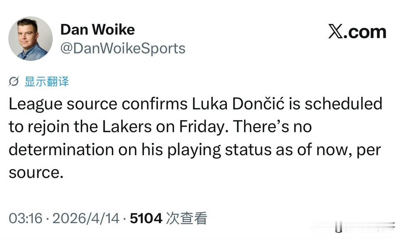 东契奇要回来了!!!卢卡计划周五回归湖人队,复出时间暂不确定! 根据记者Dan Woike最新消息透露,我从联盟内部得到消息确认,湖人球星卢卡-东契奇计划于周五回归湖人队,但是这并不代表他会立刻复出,截至目前,他的出场状态尚未确定。 周末的时候我们曾报道过,东契奇当时在斯洛文尼亚陪伴女儿,接下来他还会回到马德里,按照目前最新的消息,也就是说东契奇会在本周五之前完成第二阶段的治疗,结束后返回洛杉矶。 这只是他个人的行程计划,虽然回到洛杉矶,但是这并不意味着他已经康复了,他需要继续进行恢复,无法立刻出战,所以首轮前半段就不需要考虑了。 还是希望球员们能够恢复健康之后再打比赛,否则如果出现其他问题对自己的职业生涯也是一种伤害,祝东契奇早日康复!东契奇 湖人
