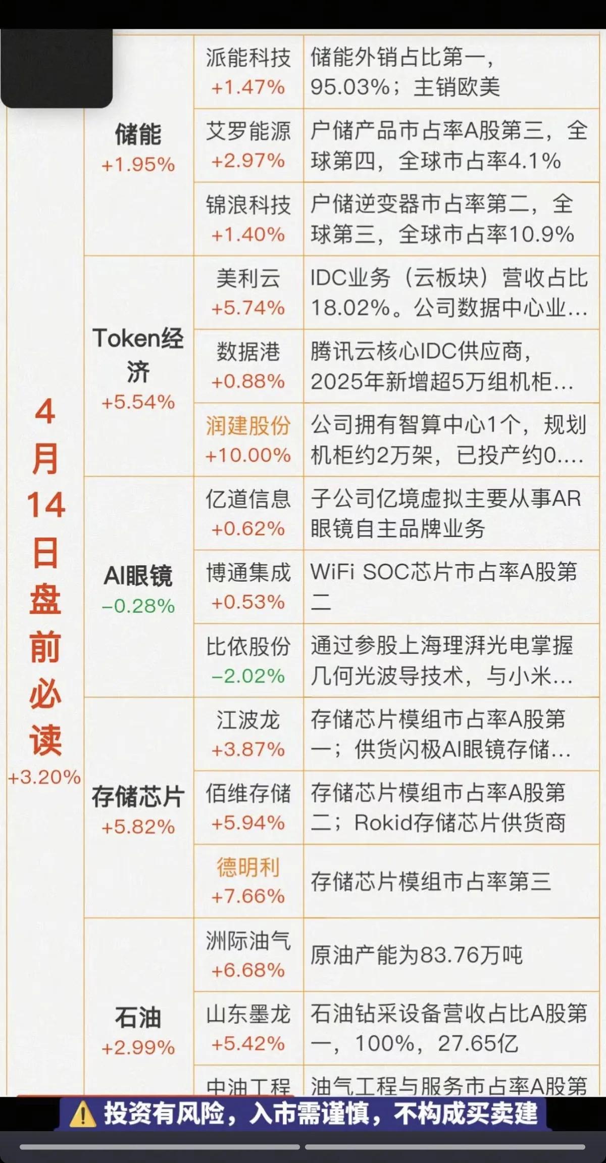 4月14日盘前必读!储能爆发、英伟达芯片租金暴涨48%,5大主线抢先看 今日盘前五大消息点燃市场!全球储能电池出货量同比激增117%,达216GWh,派能科技(储能外销占比95.03%)、艾罗能源(户储全球市占率4.1%)等概念股开盘领涨;英伟达Blackwell芯片单小时租金飙至4.08美元,两个月涨幅48%,算力租赁需求持续爆发;苹果智能眼镜进入密集测试阶段,亿道信息(AR眼镜业务)、博通集成(WiFi SOC芯片)受关注;闪迪启动高带宽闪存(HBF)原型生产线,江波龙(存储芯片模组A股第一)、佰维存储(Rokid供应商)涨幅居前;菲律宾取消液化石油气消费税,洲际油气(原油产能83.76万吨)、山东墨龙(石油钻采设备营收占比100%)应声上涨。 当前市场主线聚焦储能、AI算力、智能穿戴、存储芯片及能源政策,科技成长与资源品双轮驱动,投资者可结合业绩与政策红利挖掘细分机会。 (数据来源:公开信息整理,仅供参考,不构成投资建议)