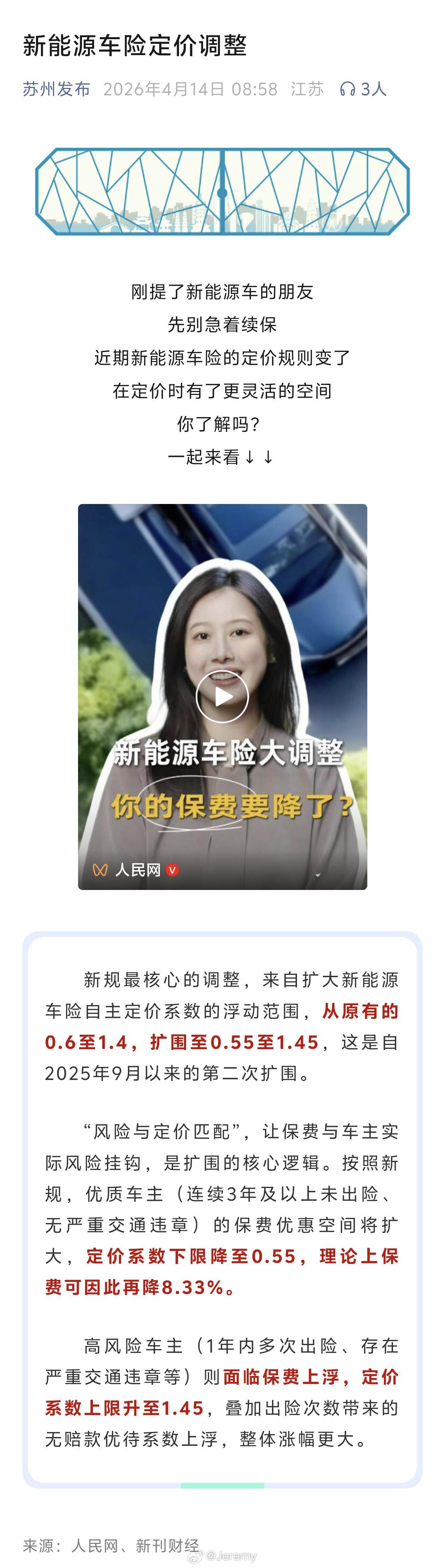 新规最核心的调整,来自扩大新能源车险自主定价系数的浮动范围,从原有的0.6至1.4,扩围至0.55至1.45,这是自2025年9月以来的第二次扩围。