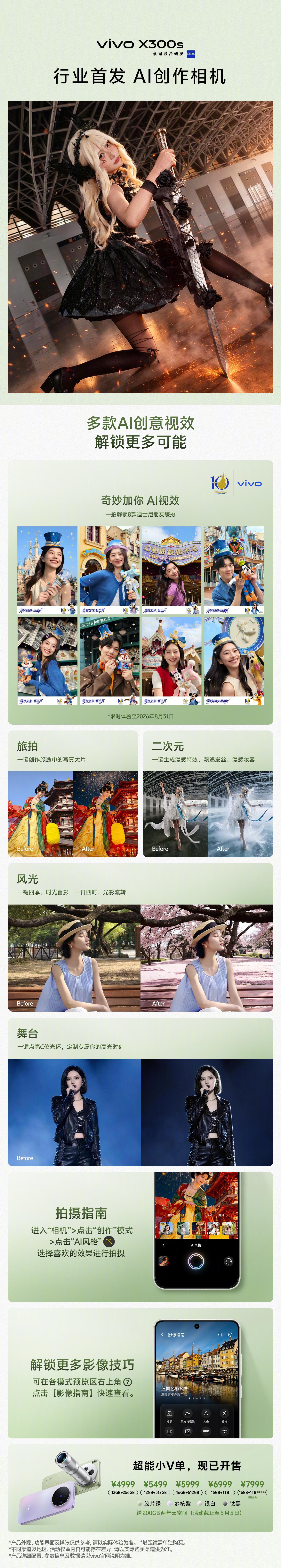 vivo X300s 超能小 V 单 首发AI创作相机,联合上海迪士尼推出「奇妙加你」限时AI视效,旅拍大片、COS特效一键生成,进一步夯实vivo在移动影像AI创作赛道的领先优势。