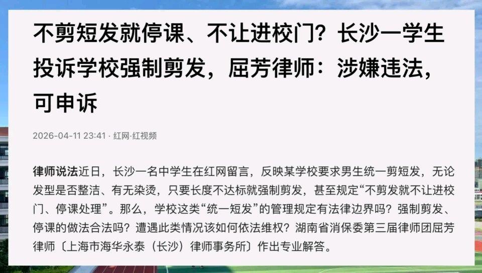 长沙中学生举报学校强制剪发,我站律师这边。剪个头就停课,这学校也太霸道了! 这几天网上有个事挺热闹。说长沙一个中学生去红网举报,说学校强制男生剪板寸头,不管你头发多干净多整洁,哪怕没染没烫,只要你不剪就直接停课,连校门都不让你进。这也太离谱了吧! 消息一出,湖南消保委的屈芳律师直接就说了:学校这种做法涉嫌违法,学生可以申诉。 本来以为大家都会支持学生,没想到下面评论全炸了锅,铺天盖地骂律师的!“规矩就是规矩”、“律师闲得慌”……最离谱的是还有人叫嚣:“把律师关起来剃光头”。 我真的看不下去了。作为一名家长,咱们得讲道理! 学校当然可以管仪容仪表,防止奇装异服、染黄毛影响学习风气,这个初衷我们都支持。但是,什么叫“管”?管是指引导和督促,绝不是把学生按在凳子上强制理发!这已经不是教育了,这叫侵权! 你去翻翻教育部《中学生日常行为规范》原文,清清楚楚写着“男生不留长发”,并没有规定学生必须剪成“几毫米”的板寸头。人家留一个整洁干净、前不遮眉的短碎发怎么了?这怎么就影响学习了? 有的杠精可能又要说了,难道学校连规矩都不能定了吗? 听好了:校规不能大过国法!《民法典》明确规定,头发是人体不可分割的一部分,学生拥有对自己身体的控制权和决定权。学校可以引导你“理什么发”,但凭什么强制“剪你头发”?这完全侵犯了未成年人的身体权和人格尊严。 更让人无法容忍的是用“停课”来威胁。在义务教育阶段,只要学生没有严重违反校纪,学校就无权单方面停止学生上课。因为头发多长了两厘米就停课,这是典型的以权压人,是对学生受教育权的赤裸裸践踏! 说到底,教育应该是春风化雨的引导,是尊重和唤醒。要是哪天学生连自己头上干干净净的几根毛都做不了主,那校园里培养出来的只会是千篇一律、眼神空洞的“流水线产品”,而不是充满朝气和独立思想的孩子。 我就想说:学生不是机器,头发也不是衡量品行的尺子。你们觉得呢?