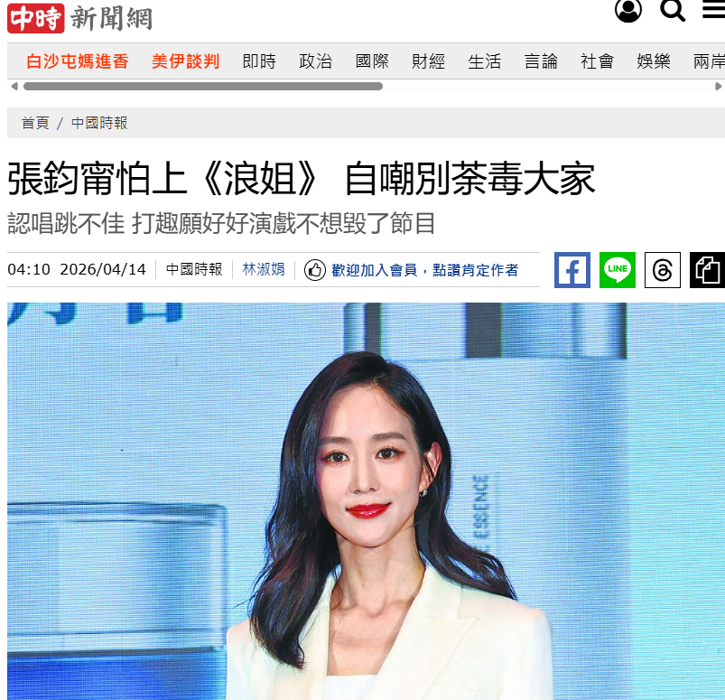 【张钧甯回应是否上浪姐】张钧甯说自己唱跳俱不佳最近热播中的《乘风2026》掀起很多讨论,曾是网友提名的热门人选。最近,在接受采访时她被问到如果被邀是否考虑参加,张钧甯幽默答:“我不想毁了节目啊!我那么诚心地研究我的表演和演技,就是因为我唱跳俱不佳,所以就不要去荼毒大家,我会好好演戏的,我答应大家!”(中时新闻网)