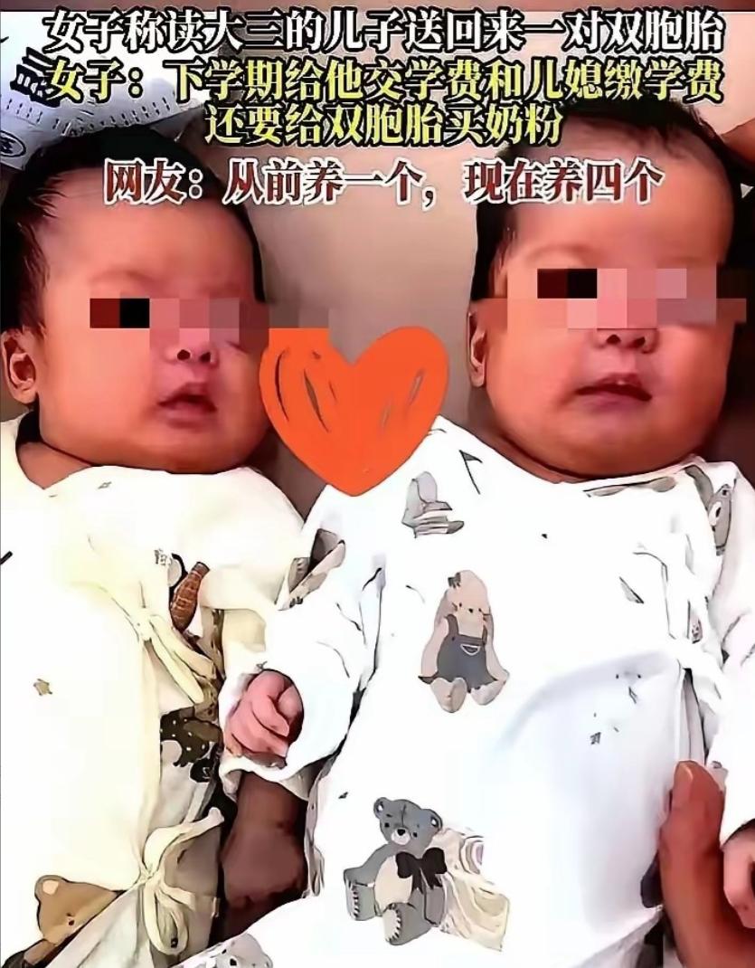 这惊喜来的有点早!上海,一名大三的男孩回家,不过这次回来并不是他自己,他还带回来一对双胞胎孩子,这也给男孩的家长打了一个措手不及,倒是提前抱上孙子了,但接下来一家人的开销,却成了一个不小的问题 这位妈妈在网上吐槽的时候算了一笔账:这学期不光要交儿子的学费,还得供儿媳妇的学费。两个孩子去上学了,留在家里的一对双胞胎,奶粉、尿不湿、辅食、衣服、疫苗……全得她来兜底 本来家里只养一个大学生,现在变成养四个人 她说自己不知道该笑还是该哭。笑的是年纪轻轻就当上了奶奶,哭的是这“惊喜”来得太早,经济上完全没准备好 有网友调侃说,这是“一步到位,直接三代同堂” 也有人替她发愁:儿子大三,儿媳妇应该也是差不多的年纪,两个人都还在读书,没有收入来源,孩子却已经生下来了。那接下来的日子,除了父母硬扛,还能靠谁 说句实在话,年轻人冲动可以理解,但生养孩子这件事,冲动之后是实打实的账单。一对双胞胎,光奶粉钱一个月少说两三千,加上尿不湿、日常开销,五六千打底。对还在上学的两口子来说,这笔钱根本拿不出来。最后兜底的,只能是父母 这位妈妈嘴上说不知道笑还是哭,实际上已经做出了选择——扛。交学费、养孙子、包圆所有开销。她抱怨归抱怨,该出的钱一分没少 但这件事真正该让人琢磨的,不是这个妈妈有多难,而是那两个把孩子生下来的年轻人,到底想没想过,自己拿什么养?如果答案是“我爸妈会管”,那这就不叫惊喜,叫甩锅 双胞胎是福气,但福气不能全靠上一辈的腰包来撑