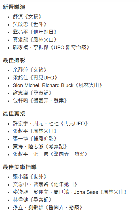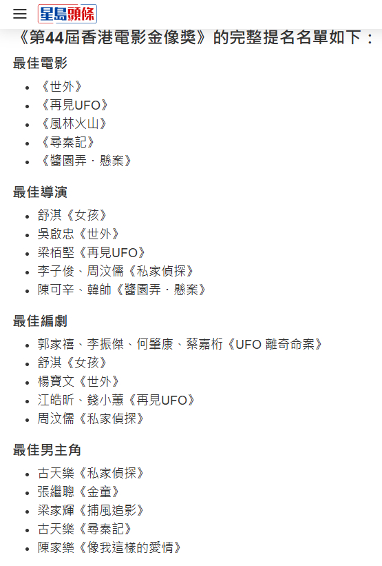 另外,舒淇凭其执导的电影《女孩》入围新晋导演、最佳导演及最佳编剧3项幕后大奖,成绩斐然。 (星岛头条)