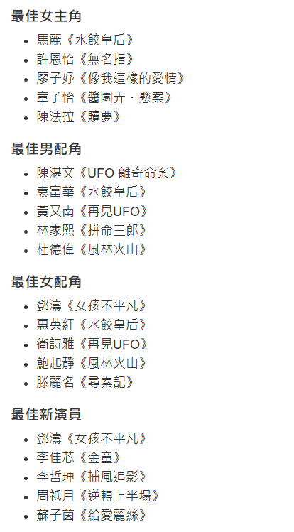 “最佳女主角”方面,竞争同样激烈,入围者包括《水饺皇后》的马丽、《无名指》的许恩怡、《像我这样的爱情》的廖子妤、《酱园弄‧悬案》的章子怡及《赎梦》的陈法拉。