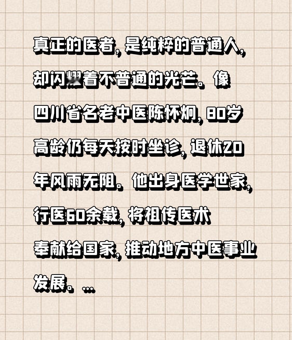 医者仁心真正的医者,是纯粹的脱离低级趣味的人!心里总却装着人民!并闪耀着正义的光芒。像四川省名老中医陈怀炯,80岁高龄仍每天按时坐诊,退休20年风雨无阻。他出身医学世家,行医60余载,将祖传医术奉献给国家,推动地方中医事业发展。还有盱眙县人民医院的周云方,怀揣治病救人的理想,坚守岗位。援非期间,他用中医穴位按压治好了农场主的颈脖痛,获对方称赞。不仅是他们,还有众多在消毒、供应、后勤等“二线”岗位默默奉献的人员,他们都不为名不为利,一心践行医者人心,治病救人。