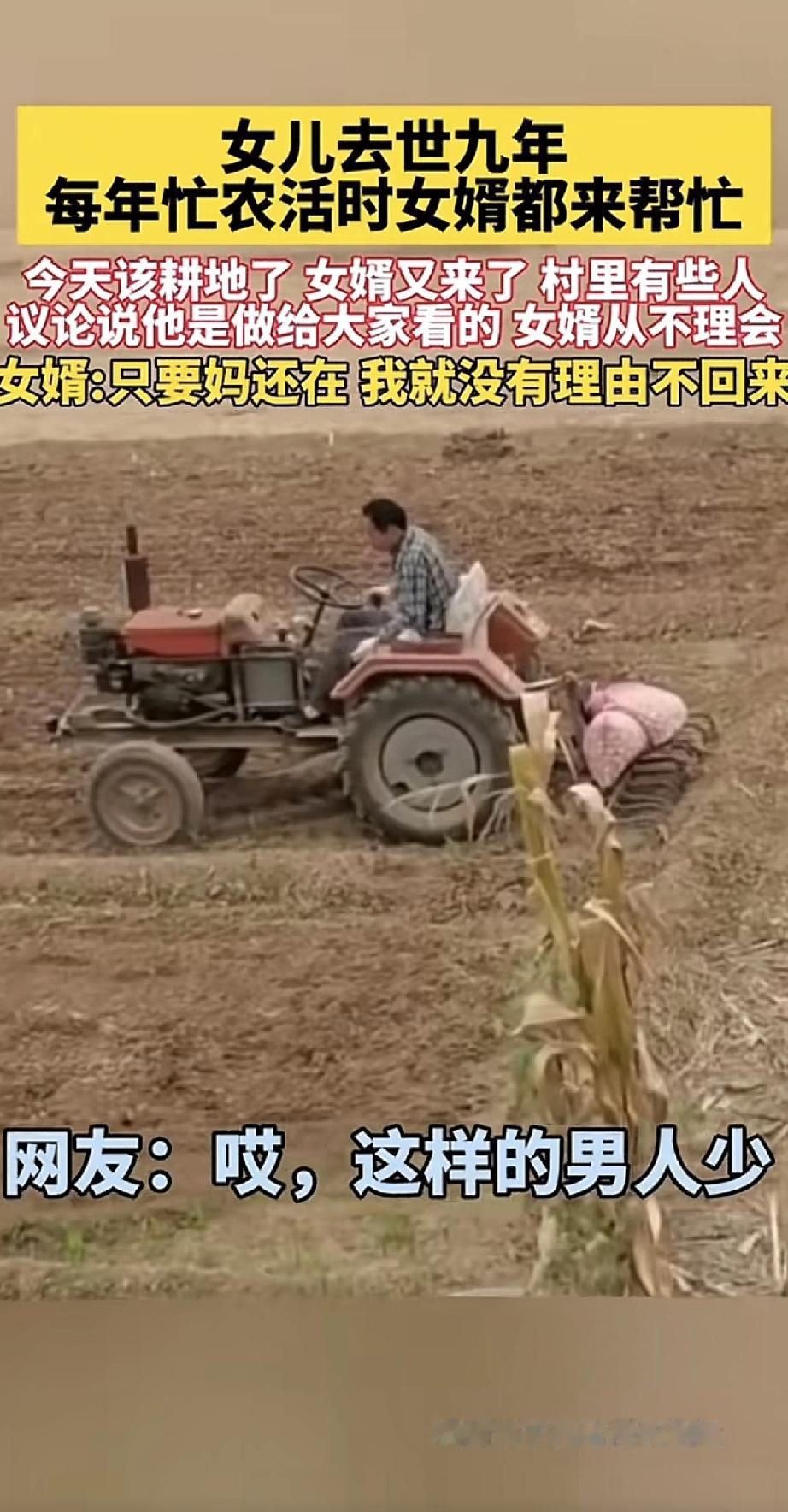女儿去世九年了,每年农忙时,女婿都会准时出现在田里。 今年该耕地了,他又来了。村里有些人闲言碎语,说他装样子、做给大家看。女婿从不理会这些,只管埋头干活。 有人问他为什么还来,他说:“只要妈还在,我就没有理由不回来。”一句话,说得人鼻子发酸。 九年了,他没有再娶,也没有忘记这个家。逢年过节照常来,农忙时比谁都积极。不是做给别人看,是心里真有这个妈。 网友感叹:这样的男人,太少了。有些人活着,就已经是别人的依靠了。