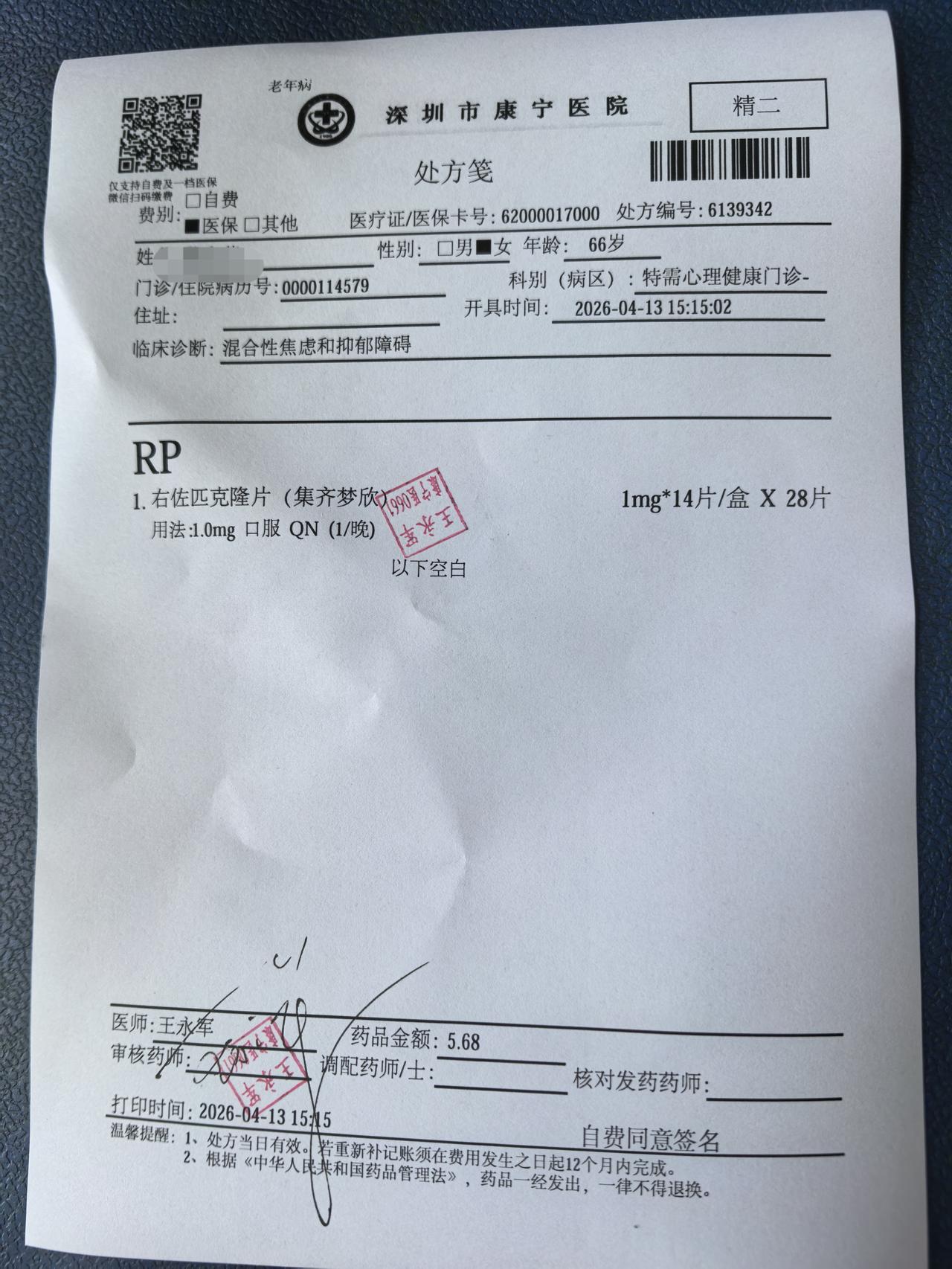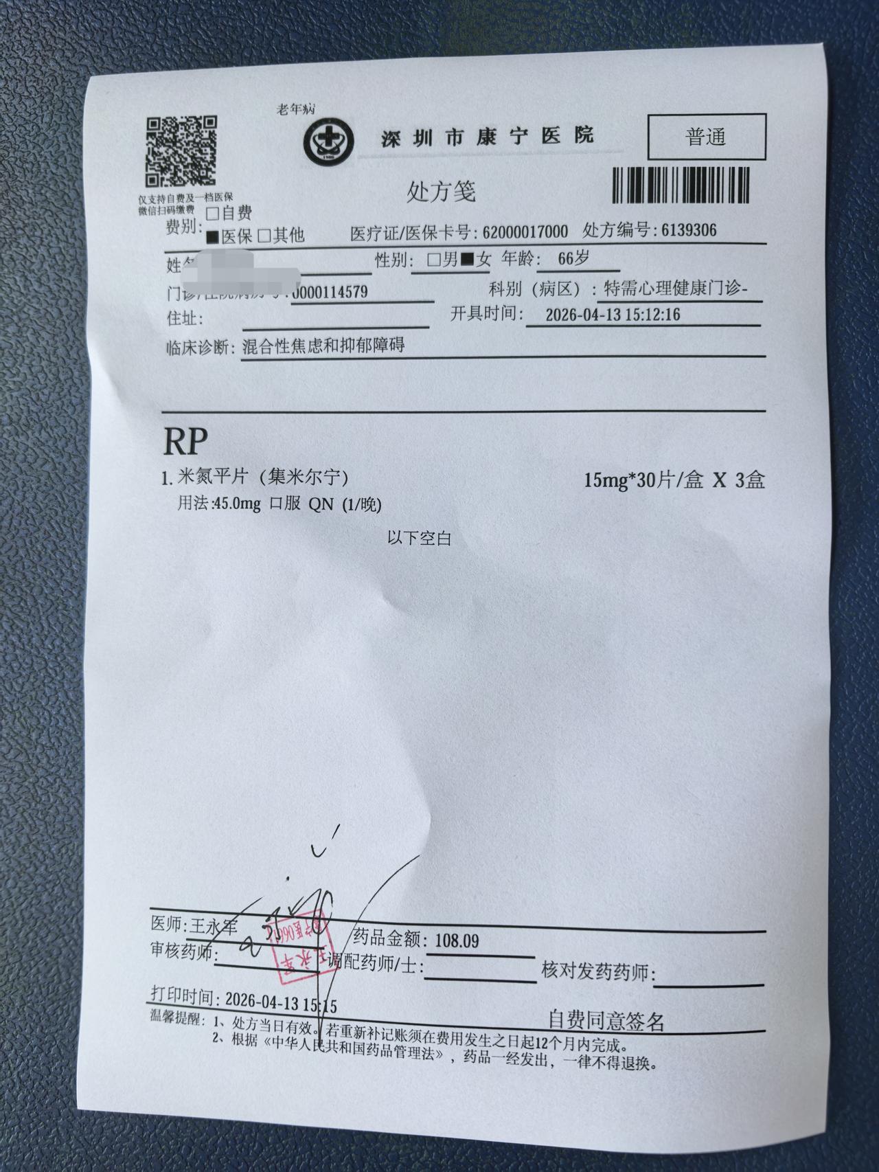 十年的轻度抑郁,心悸心慌,失眠,一直服阿普唑仑,氟西丁也有效。为根治病,花500元预约了“特需心理健康门诊”专家号。 专家看得很认真,换了新药米氮平为主药,不能入睡的时候就服用右佐匹克隆片。之前按小剂量服米氮平见效不明显,这次医生按大剂量开了药。